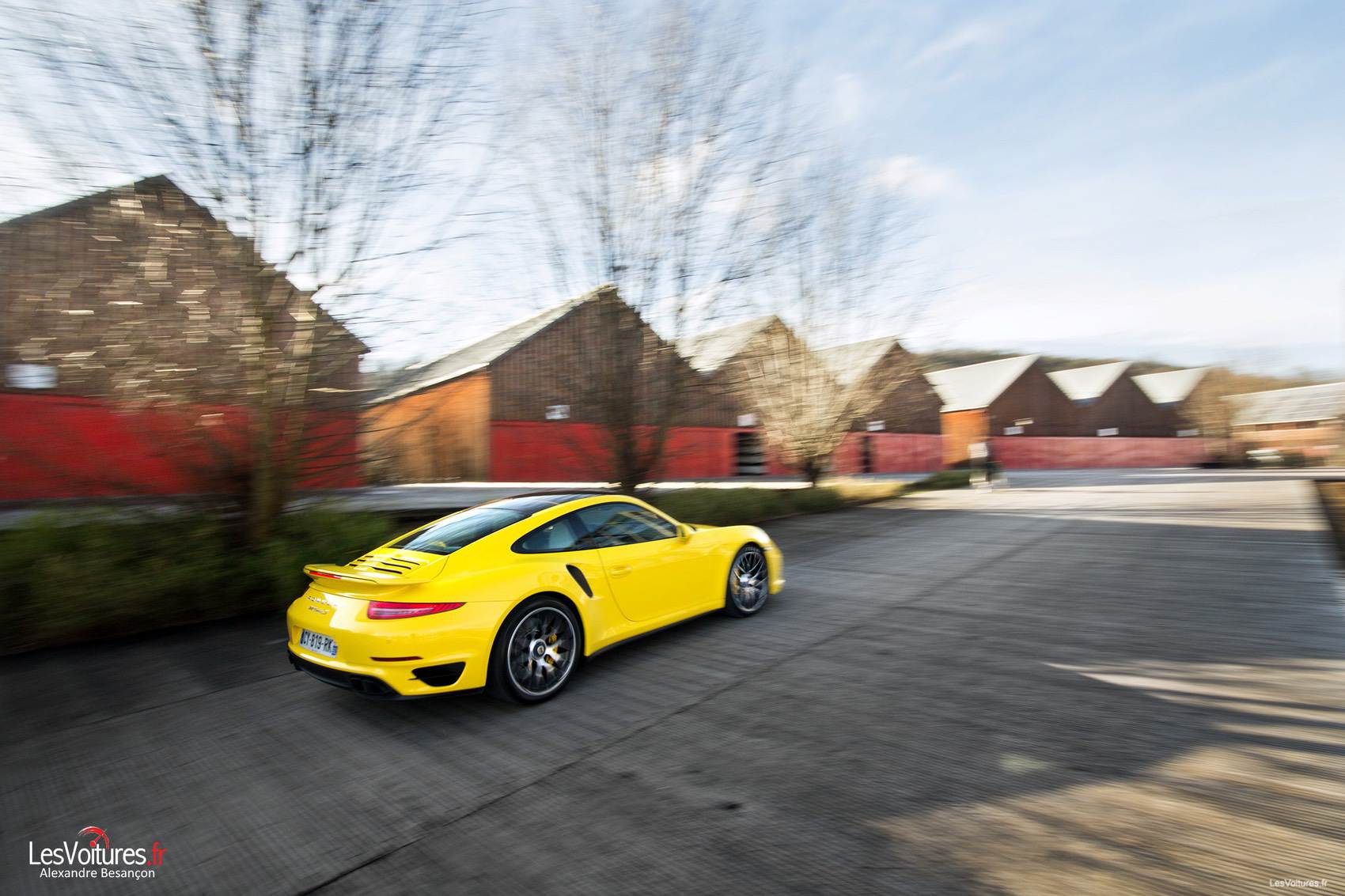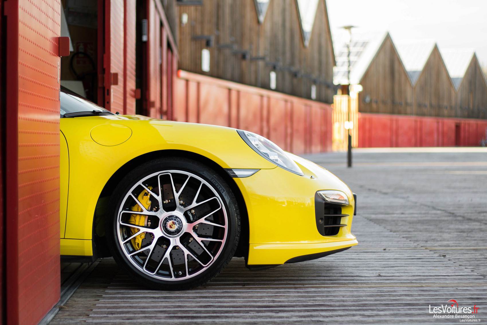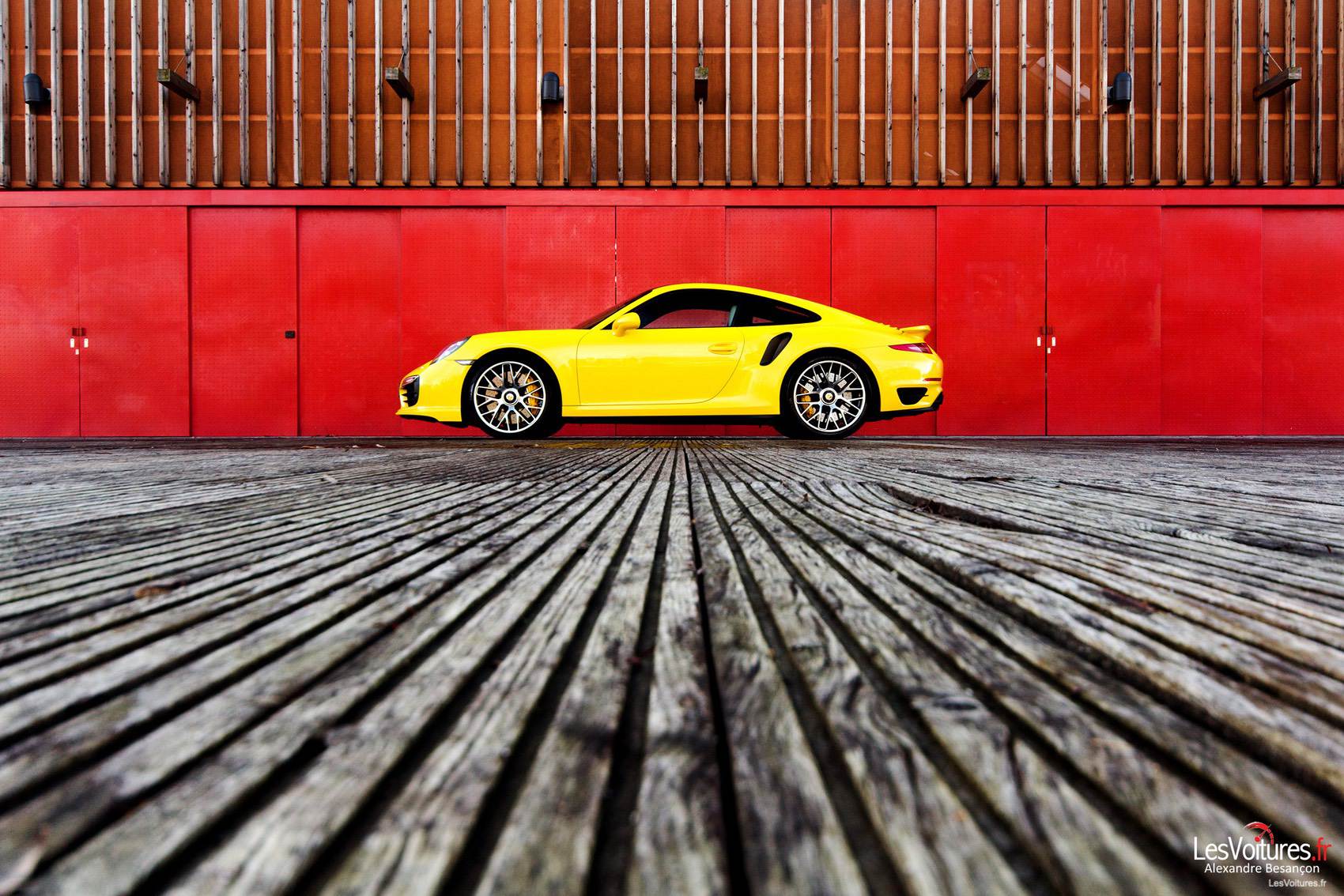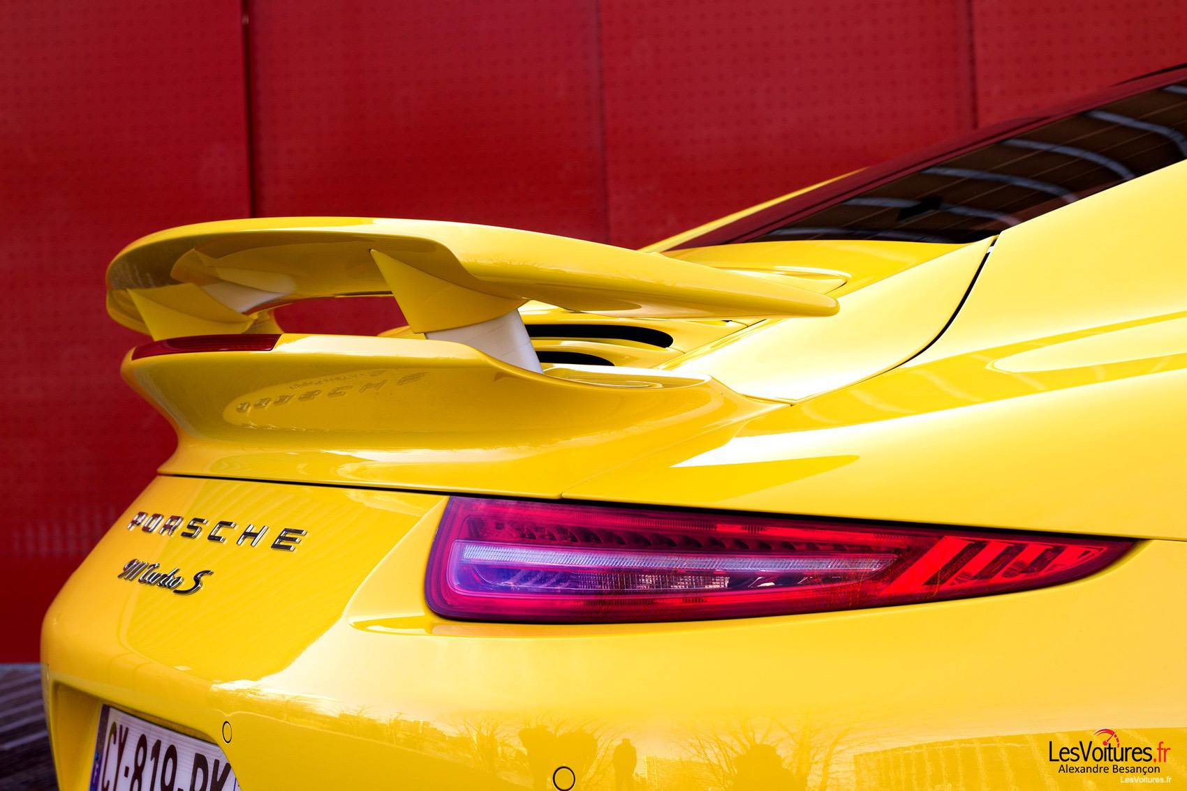 Le nom de la teinte de notre rutilant objet à quatre roues motrices et directrices nous a immédiatement mis dans l’ambiance. Le « Jaune Racing » de notre 911 Turbo S d’essai est tout simplement exceptionnel. Certains critiqueront peut-être une certaine prétention colorée mais la 911 l’assume fièrement et au premier coup d’œil les optimisations de cette version S ressortent superbement.