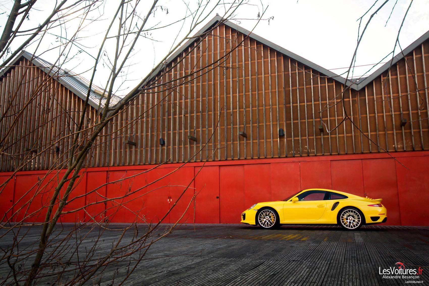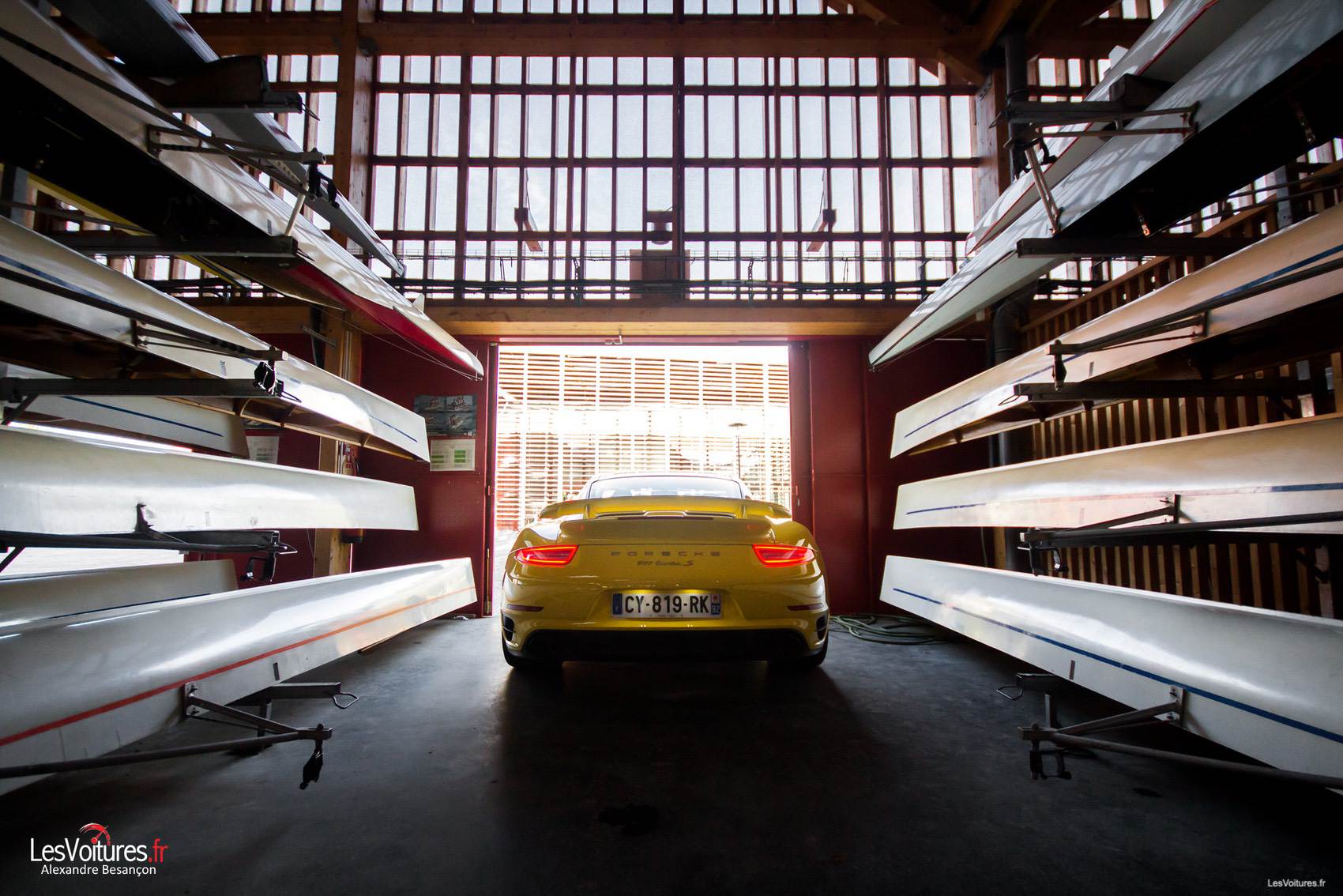 Chaussée de superbes jantes bicolores de 20 pouces, dont l’écrou central vient tout droit de l’univers « Racing », la 911 Turbo S en impose avec son look hyper sportif. Le sol et la structure en bois de la base nautique de Sèvres subliment la 911 toute de jaune vêtue. Le rouge des portes finit par dresser un tableau automobile haut en couleurs. La fluidité des courbes de l’exclusive 911 contraste alors magnifiquement avec les lignes droites et tendues de la bâtisse.