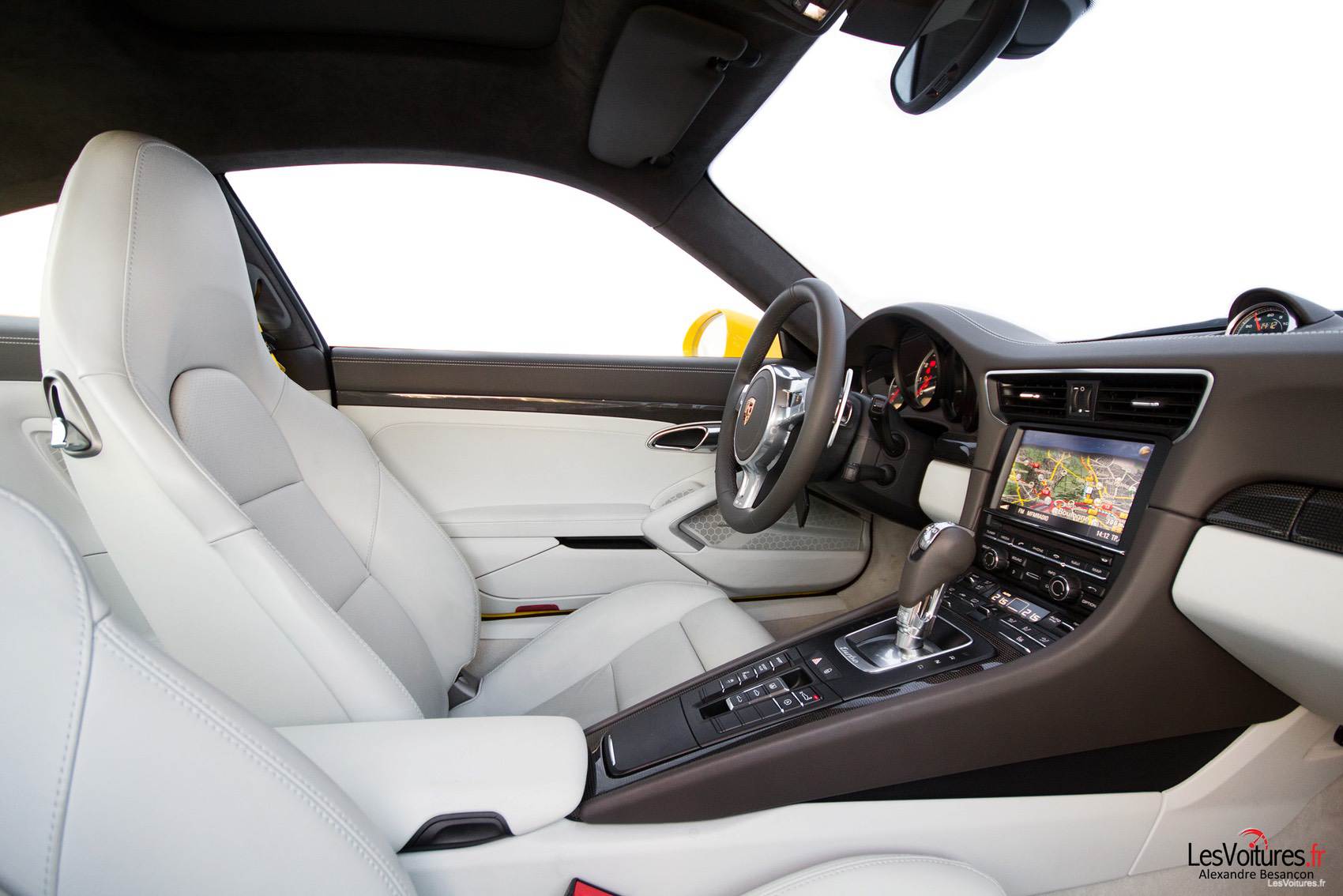 A l’intérieur, la finition atteint un niveau d’excellence, le confort est ultime et les ceintures de sécurité jaune vous rappelleront que vous n’êtes pas au volant d’une « petite » Porsche. A noter que notre 911 d’essai dispose du toit coulissant électrique optionnel.