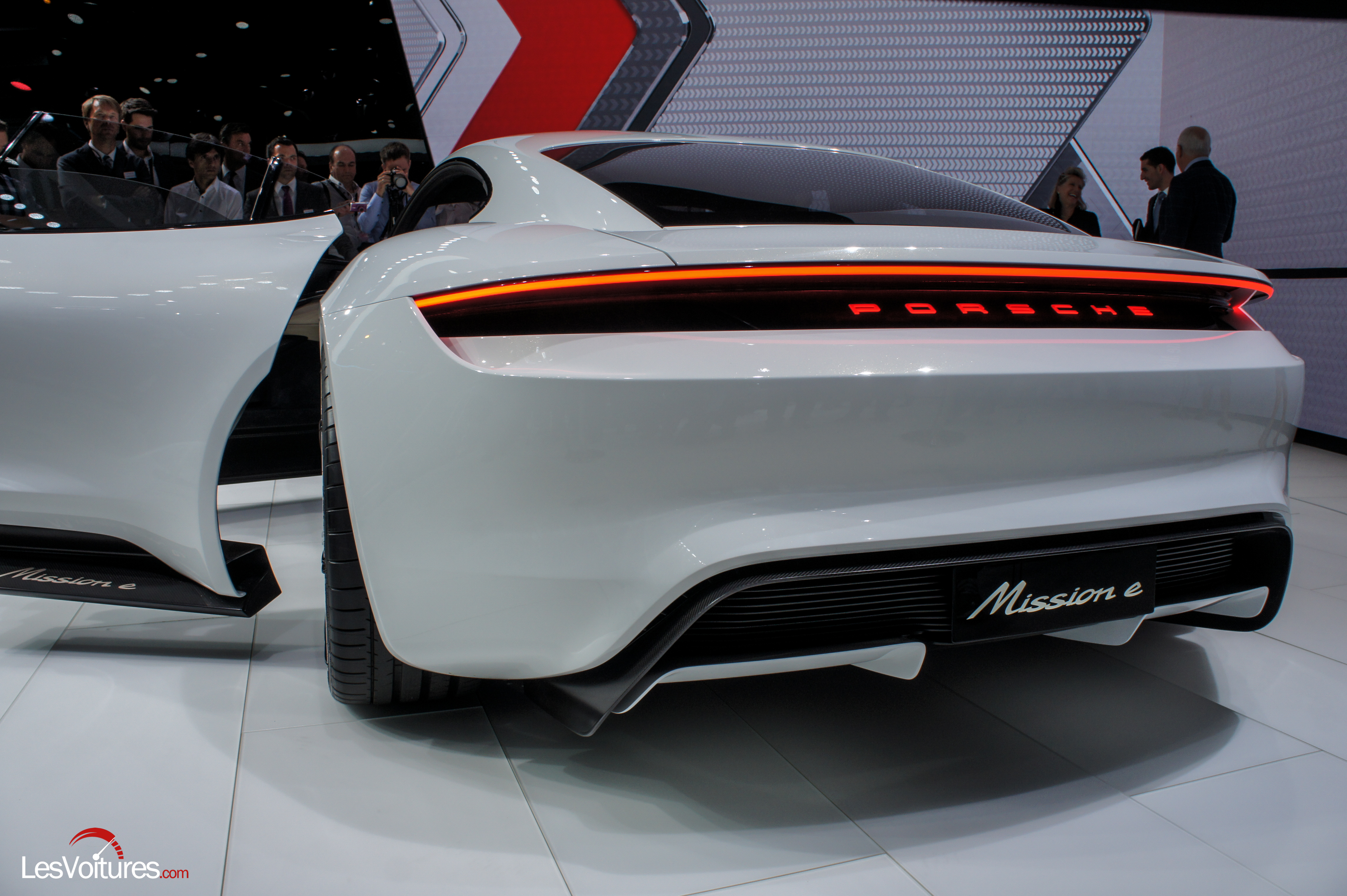 Les lignes du Concept Mission E sont fluides et élancées. Le Cx (coefficient aérodynamique) du véhicule n’a pas été dévoilé, mais il y a fort à parier que les ingénieurs de Porsche ont fait fort. Une lame noire fait le tour du véhicule à robe blanche, soulignant boucliers avant, bas de caisse et bouclier arrière. Les feux avant à quatre projecteurs sont bordés d’ouïes aérodynamiques, ce qui confère un regard très acéré au visage du concept. A l’arrière de l’auto, le toit plongeant se termine dans une ligne de feux arrière rappelant quelque peu la 964, dont les optiques droite et gauche se rejoignaient. Un extracteur arrière démesuré vient finir de souligner le sang racé du concept.