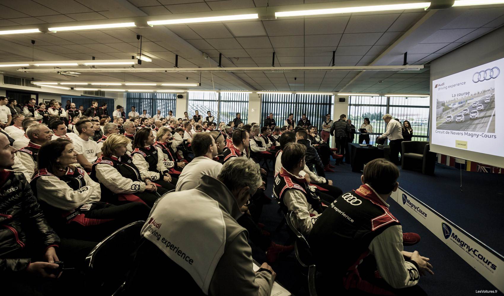 Une fois les montures découvertes, une autre surprise attend les pilotes en herbe. Passage au vestiaire pour s’équiper de la panoplie complète d’un pilote qui se respecte : combinaison, bottes de conduite, gants, cagoule. Les 125 amateurs qui sont rentrés en sont ressortis transformés. En apparence pour l’instant en tous cas ! De concert, tous les participants se sont alors dirigés vers la Salle Ayrton Senna, la même qui accueillait tous les briefings de Grand Prix de Formule 1 !