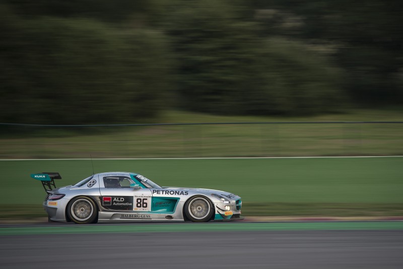 Derrière, la Mercedes-Benz SLS AMG GT3 #86 du HTP Motorsport est 6ème. Elle est accompagnée par une autre SLS AMG GT3 à la 7ème place, la #63 du Black Falcon. Du côté des « Bentley Boys », la Bentley Continental GT3 #7 remonte dans le classement mais de nouveaux soucis sont apparus et elle vient de ressortir de son box avec une lame avant toute neuve. Elle est actuellement 13ème.