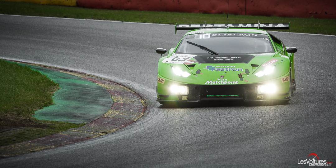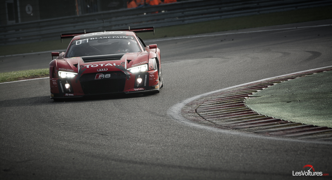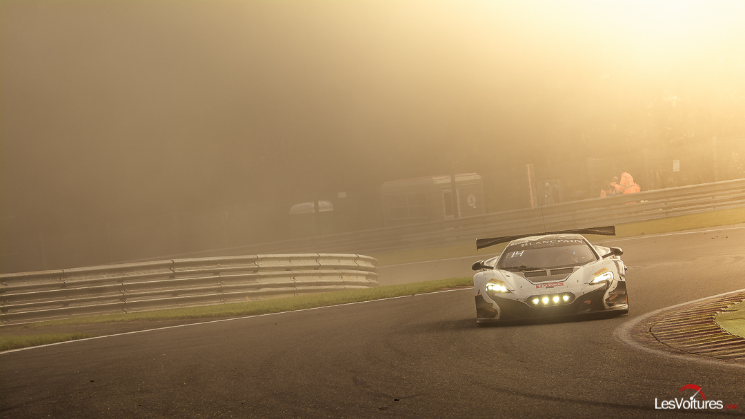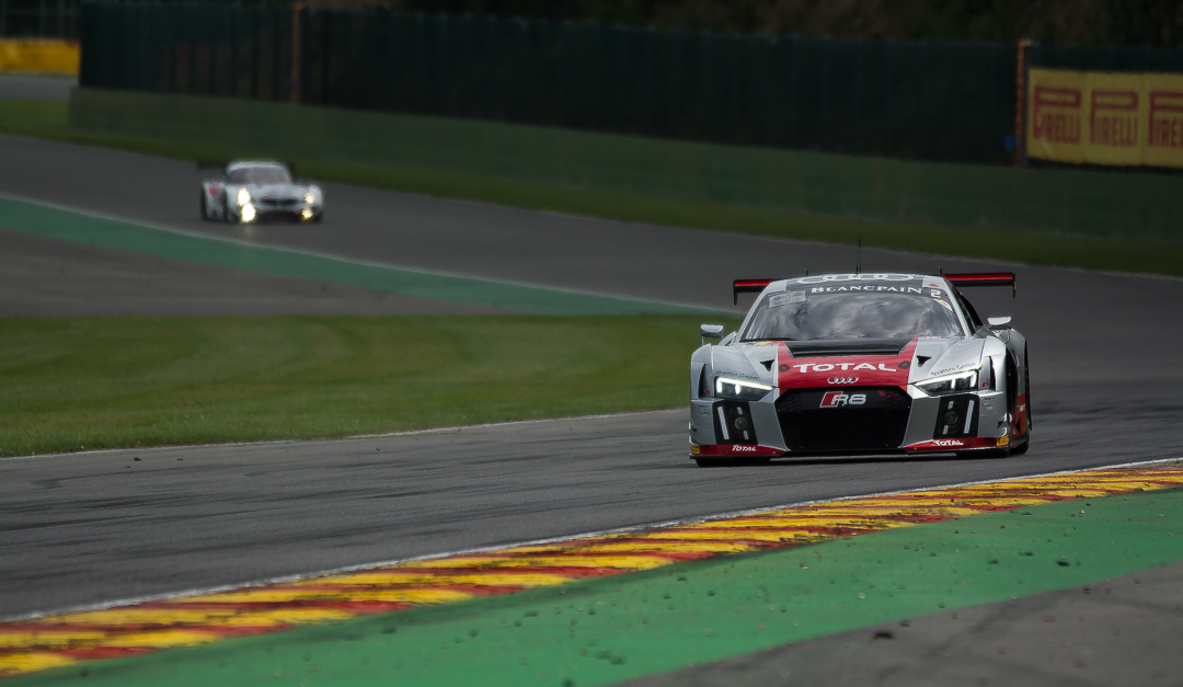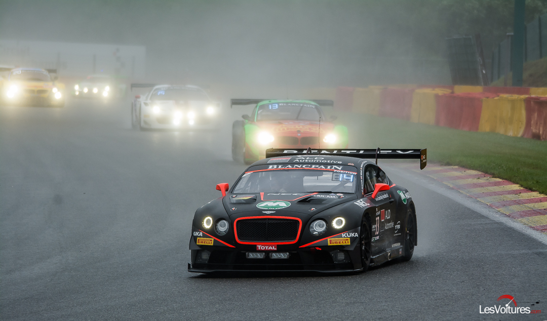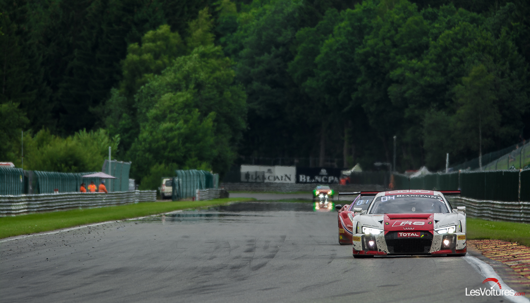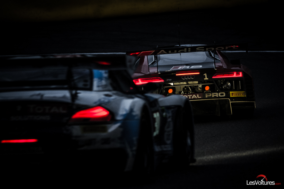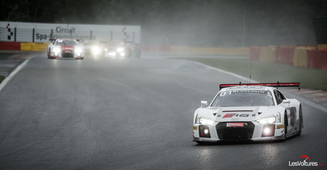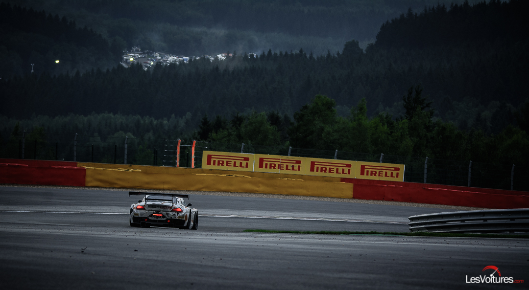 Après les premières heures de course qui se sont déroulées sous une pluie battante et avec plusieurs sorties des voitures de sécurité, la nuit a vu tomber beaucoup de favoris à la victoire. Durant la 6ème heure de course, la voiture de tête, l’Audi R8 LMS #1, pilotée par Laurens Vanthoor, est sortie de la piste à Stavelot. Après être resté longtemps immobilisé en bord de piste, le pilote Belge a pu rejoindre son stand pour réparer mais le mal était fait. Un peu plus tard, c’est la Bentley Continental #7 M-Sport qui a abandonné suite à un aquaplanning au Combes, Andy Meyrick percutant même une autre GT3. La Nissan GT-R Nismo GT3 #23 a également était contrainte à l’abandon suite à des soucis techniques.