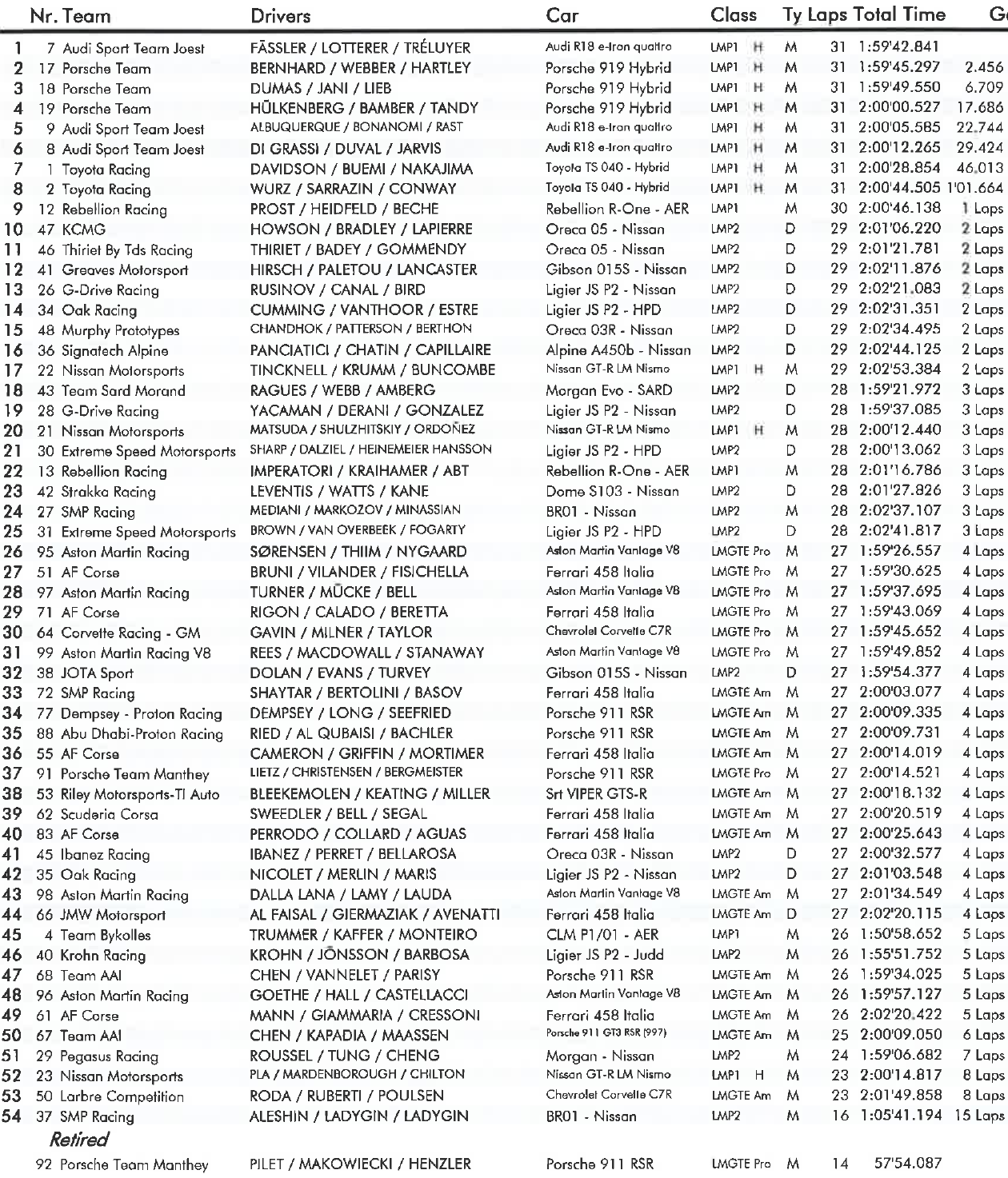 La première heure de course a été marquée par l’abandon de la Porsche 911 RSR #92. La GTE allemande a d’abord perdu de l’huile sur la piste avant de prendre feu. Les Rebellion #13 et Dome #42 ont été impliquées dans cet incident mais les deux prototypes ont repris la course. Aux termes de ces deux premières heures, L’Audi #7 est donc en tête devant les trois Porsche, dans l’ordre : #17, #18, #19.
