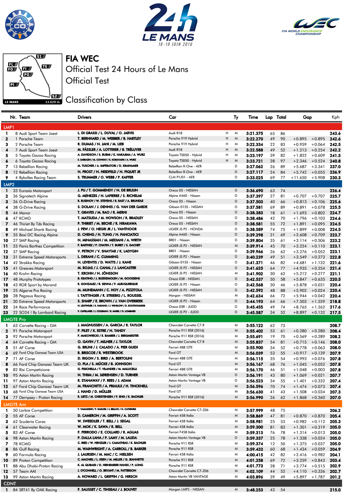 – Temps combinés par catégorie Journée Test 24 Heures du Mans 2016 :