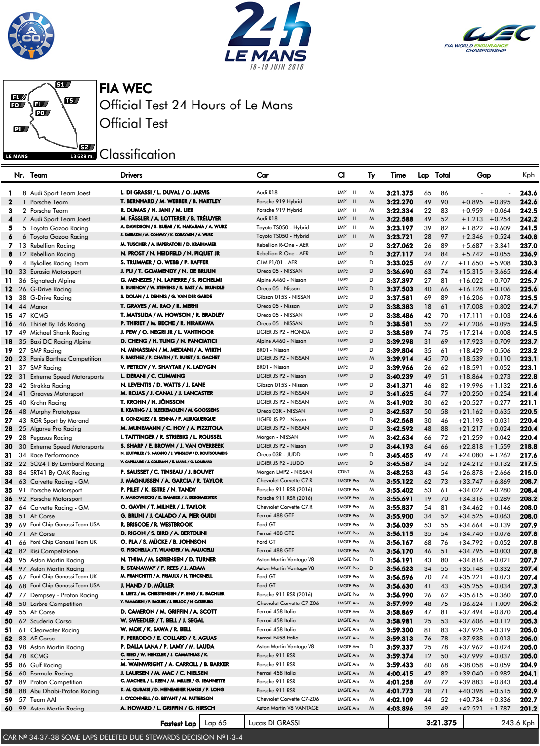 – Temps combinés Journée Test 24 Heures du Mans 2016 :