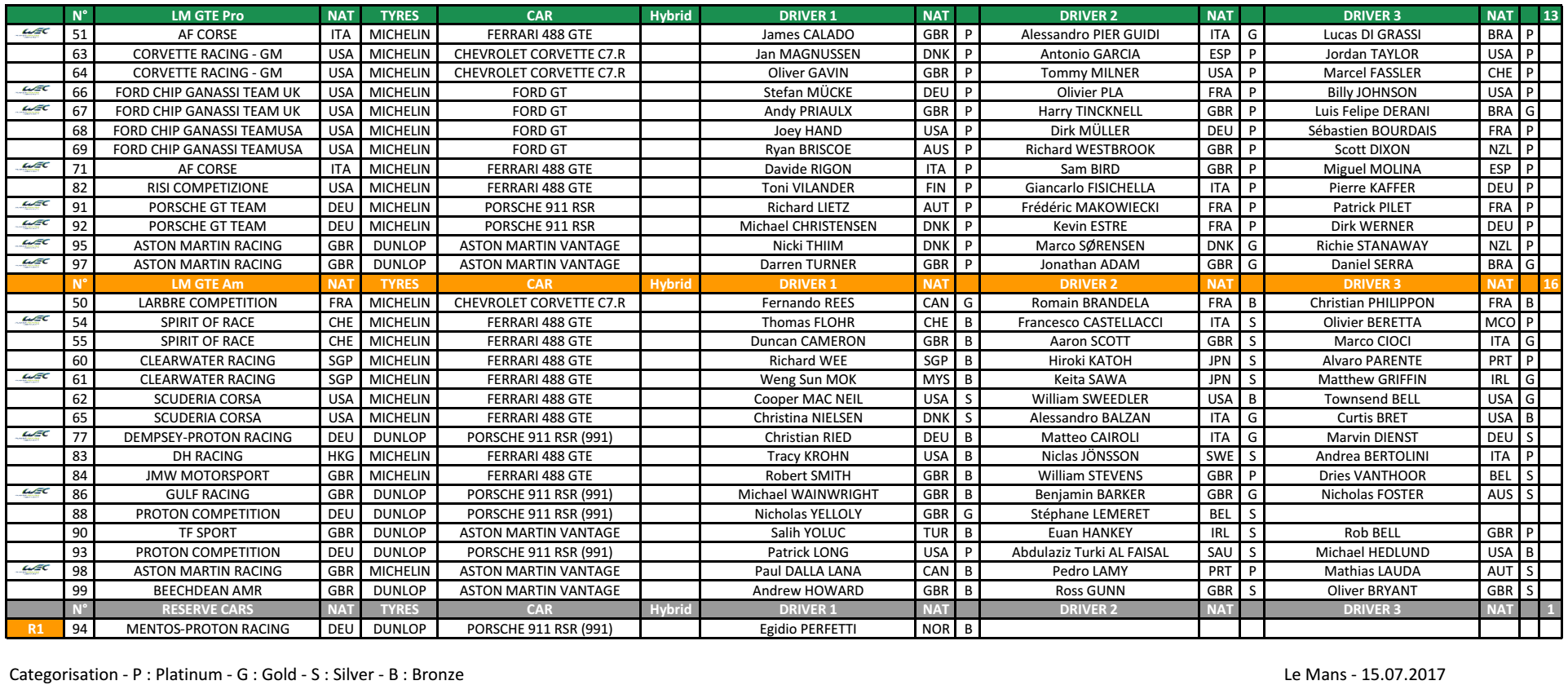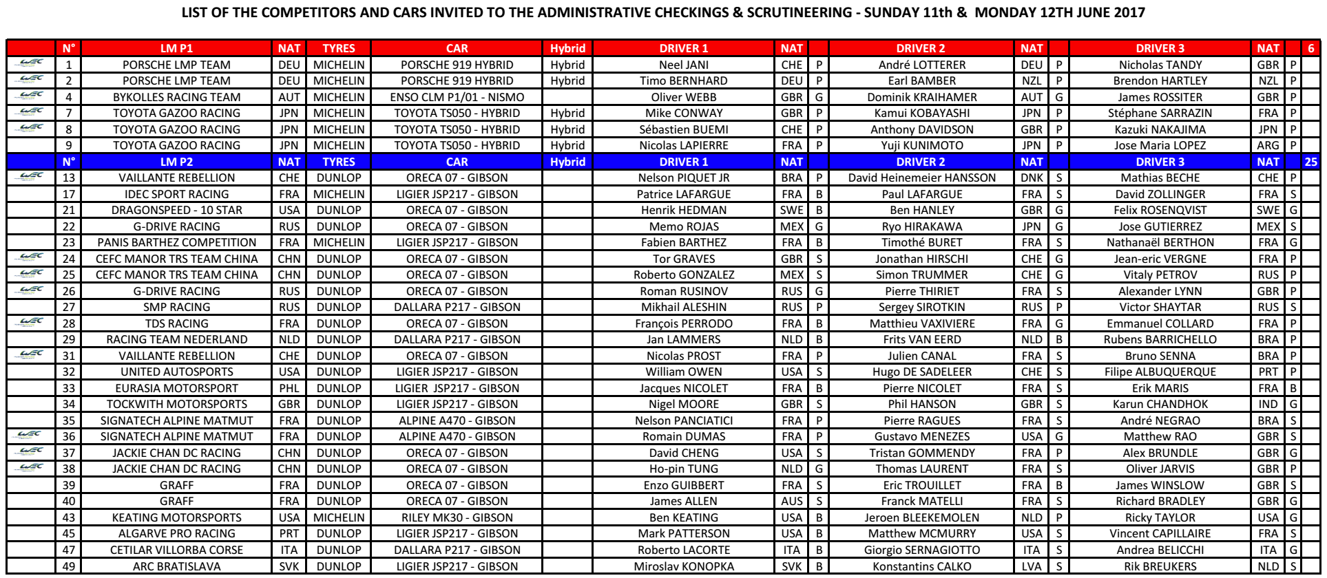 Découvrez ci-dessous la liste définitive des engagés aux 24 Heures du Mans 2017 (à télécharger ici).