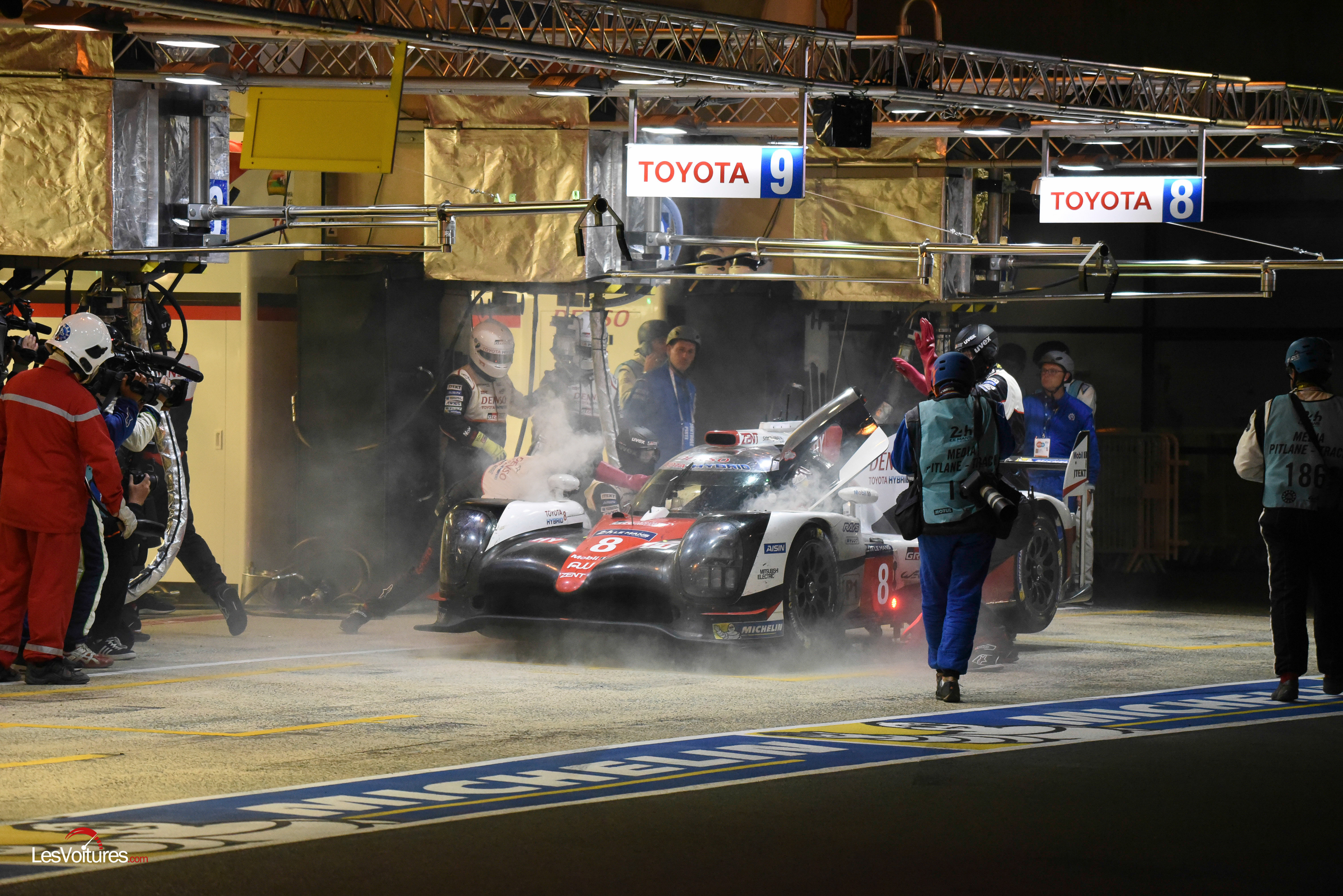 La dramatique du Sport Auto a de nouveau frappé le Toyota Gazoo Racing, longtemps dominateur mais en quelques 20 minutes, les deux Toyota TS050 HYBRID qui jouaient encore la gagne ont abandonné. Les déboires des japonaises ont débuté bien avant avec ceux de la #8. Aux alentours de 22h50, et alors qu’elle pointait à la 2ème place avec à son volant Buemi, le prototype hybride rentre à son stand en laissant échapper de la fumée.