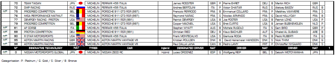 Les plus nombreux sont les titulaires de licences françaises (39) devant les Britanniques (29), les américains (17) puis les italiens (15). A noter l’important contingent de licenciés russes (8) ou encore la présence d’au moins un pilote suisse dans chacune des écuries engagées en LM P1. Des quatre catégories, celle où se côtoieront le plus de pilotes aux licences différentes est le GTE Am avec 19 nationalités représentées.