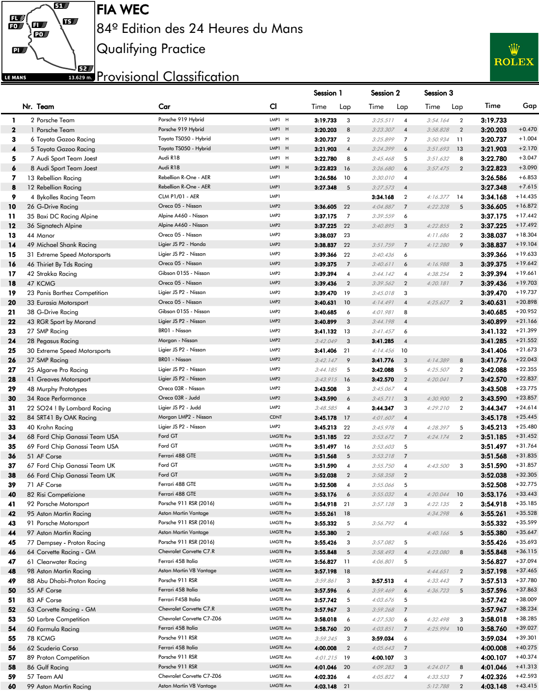 - Temps combinés Qualifications 24 Heures du Mans 2016 :