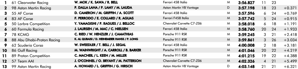 En LM GTE Am, Emmanuel Collard reste très longtemps la référence en 3’57’’742, avec sa Ferrari 458 Italia #83. Il est délogé par la Ferrari AF Corse (#55), puis par Rob Bell, au volant de la Ferrari 458 Italia #61 du Clearwater Racing. Finalement, une Aston Martin, la #98, se glisse entre les Ferrari de tête. Les V8 Vantage sont restées discrètes toute la soirée…