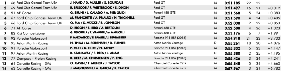En LM GTE Pro, les choses s’animent après 15 minutes de session. Deux Ford se retrouvent en tête. La Ford GT #67, avec Harry Tincknell, et la #66, avec Olivier Pla. En 3’51’’590 et 3’52’’038, les américaines devancent une Ferrari.