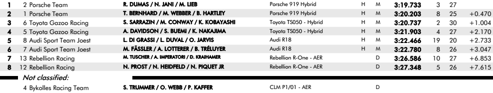 Stéphane Sarrazin est le premier à signer un temps de référence en 3’20’’737. Un excellent tour pour la Toyota TS050 Hybrid #6. Après 12 minutes, Neel Jani prend le contrôle en 3’19’’733 (Porsche 919 Hybrid #2). Un temps qui lui permet de passer en tête sans pourtant bénéficier d’un tour clair, notamment dans la ligne droite qui suit le virage du karting où il subit le trafic. Après 30 minutes d’essais, la Porsche 919 Hybrid #1 se lance pour un tour rapide avec Mark Webber au volant… mais un drapeau rouge stoppe son élan et interrompt la séance de 22h32 jusqu’à 22h43.