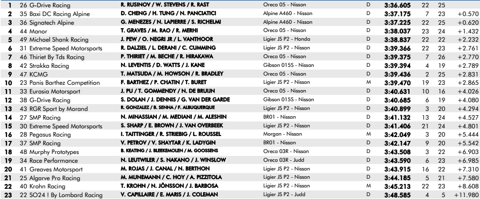 En LM P2, G-Drive Racing domine le classement avec l’Oreca 05 #26, devant les deux Alpine A460 (la #35 devant la #36).