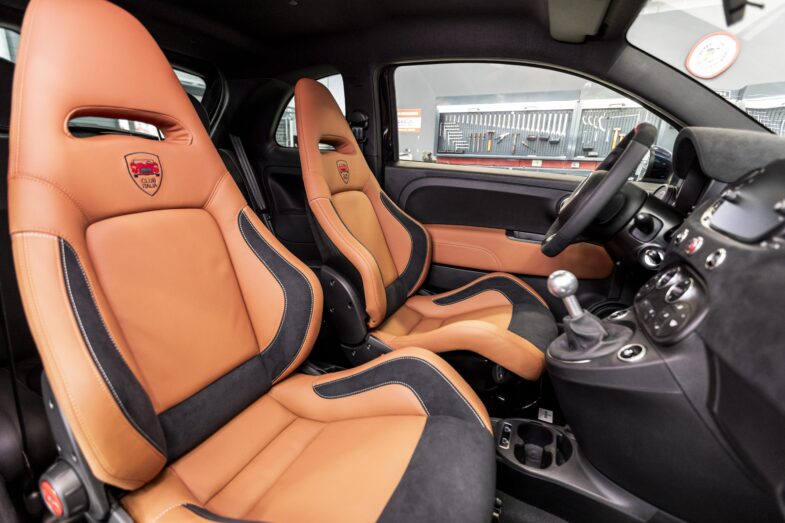 Dans l’habitacle de cette Abarth 695 Club Italia, place au raffinement à l’italienne avec des sièges baquets en cuir tabac, un volant en cuir et Alcantara avec inserts en carbone, ainsi qu’un marquage personnalisé.