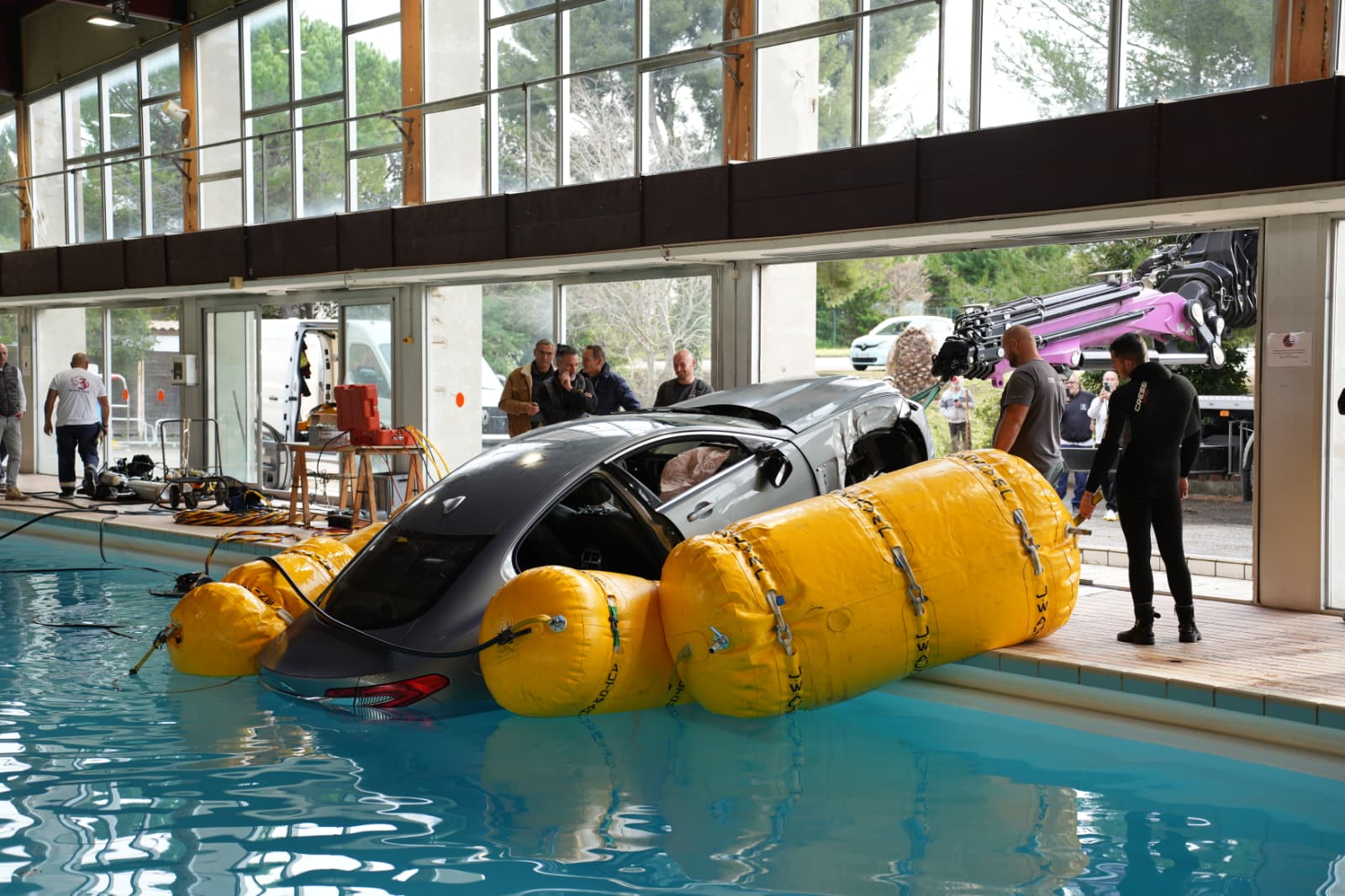 Rappelons les faits : une automobiliste âgée de 38 ans, accompagnée de sa fille de 5 ans, avait perdu le contrôle de son véhicule, qui avait terminé sa course dans l’eau chlorée de la piscine municipale de La Ciotat. Si la conductrice s’en est sortie indemne, la présence de la Jaguar XF, affichant près de 1,8 tonne sur la balance, posait un défi technique majeur. Suite à cet accident survenu à La Ciotat, pour permettre l’extraction, les équipes ont dû démonter les baies vitrées situées sur la trajectoire de sortie, avant d’installer de larges bouées autour de la carrosserie.