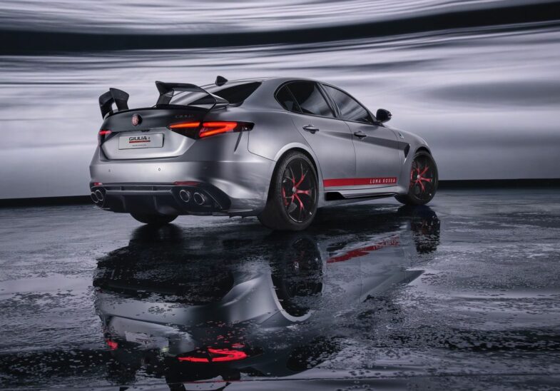 Sous le capot, cette Alfa Romeo Giulia reste fidèle au cœur mécanique qui a fait la réputation de la Quadrifoglio. On retrouve le V6 2.9 l biturbo de 520 ch, mais cette édition pousse l’aérodynamique à un niveau inédit. Le constructeur automobile italien faisant partie du groupe Stellantis a développé un pack aérodynamique complet, comprenant des flicks avant, des profils sous la caisse, des jupes latérales spécifiques et surtout un aileron arrière en deux éléments, directement inspiré des foils du voilier Luna Rossa. Cet ensemble permet de générer un appui jusqu’à cinq fois supérieur à celui de la Quadrifoglio standard, avec un maximum annoncé de 140 kg d’appui à 300 km/h.