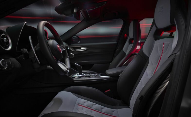 L’habitacle de l’Alfa Romeo Giulia Quadrifoglio Luna Rossa poursuit cette montée en exclusivité. Alfa Romeo a intégré des sièges baquets spécifiques, mêlant gris et rouge, ainsi que des inserts en carbone disséminés sur la console et les panneaux de porte. Le détail le plus spectaculaire reste toutefois l’incrustation, dans la planche de bord, d’un fragment authentique de voile Luna Rossa, un matériau issu directement du monde de la haute compétition nautique. Chaque exemplaire reçoit également une plaque numérotée et un certificat attestant de son statut de série limitée.