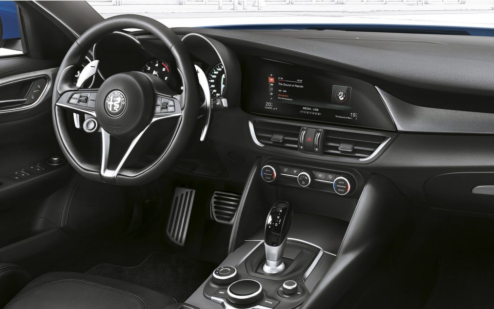L’habitacle de la Giulia Veloce reprend les mêmes codes sportifs. Ils sont matérialisés par des sièges et un volant sport en cuir et des inserts au rendu métallique.