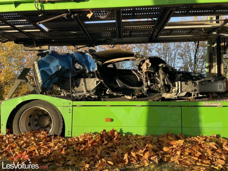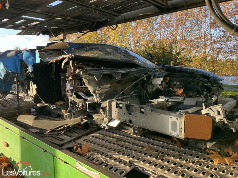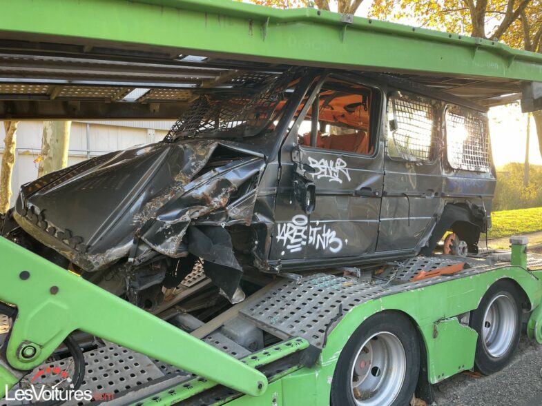 Non loin de l’A110, un Mercedes-AMG Classe G accidenté pour les besoins du film gît lui aussi, abandonné sur une autre remorque du même poids lourd. Deux reliques cinématographiques transformées en épaves, exposées aux regards des passants et autres curieux.
