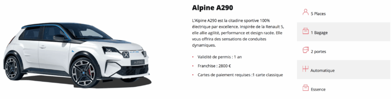 Sur le site internet Avis, l’Alpine A290 présentée est une « Première Édition Beta ». Il reste aussi à savoir si c’est bien cette belle version de l’A290 qui peut être louée.