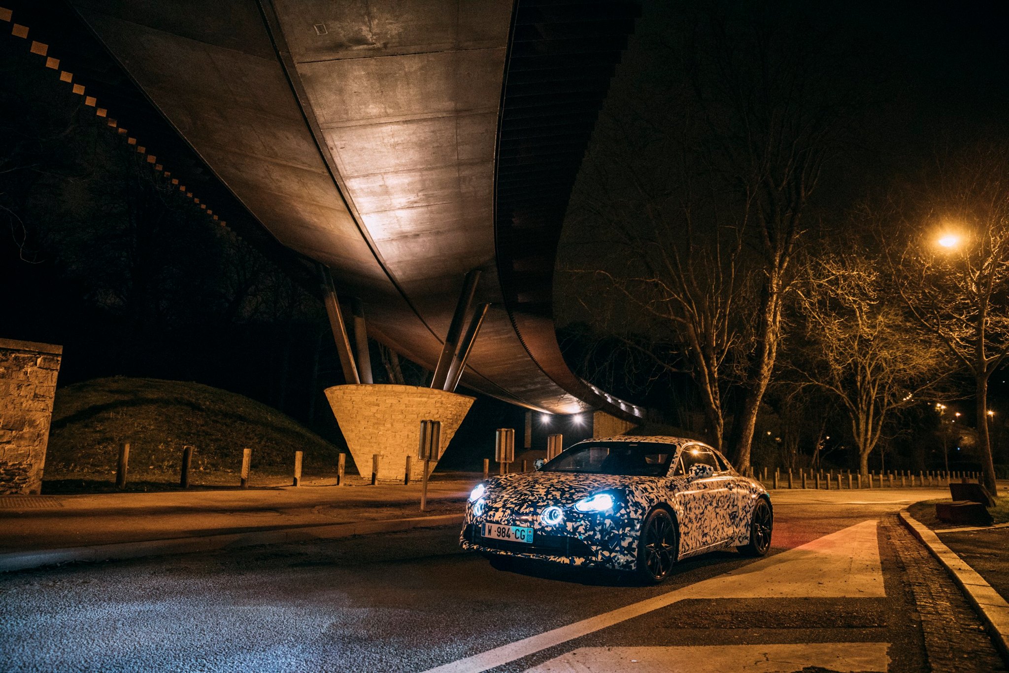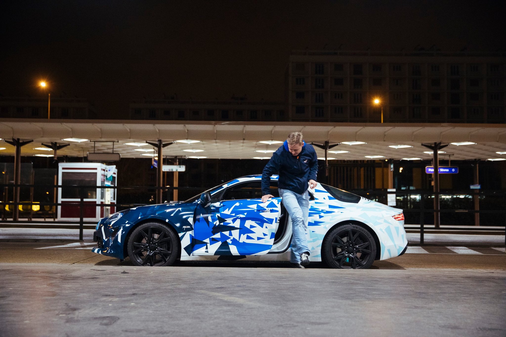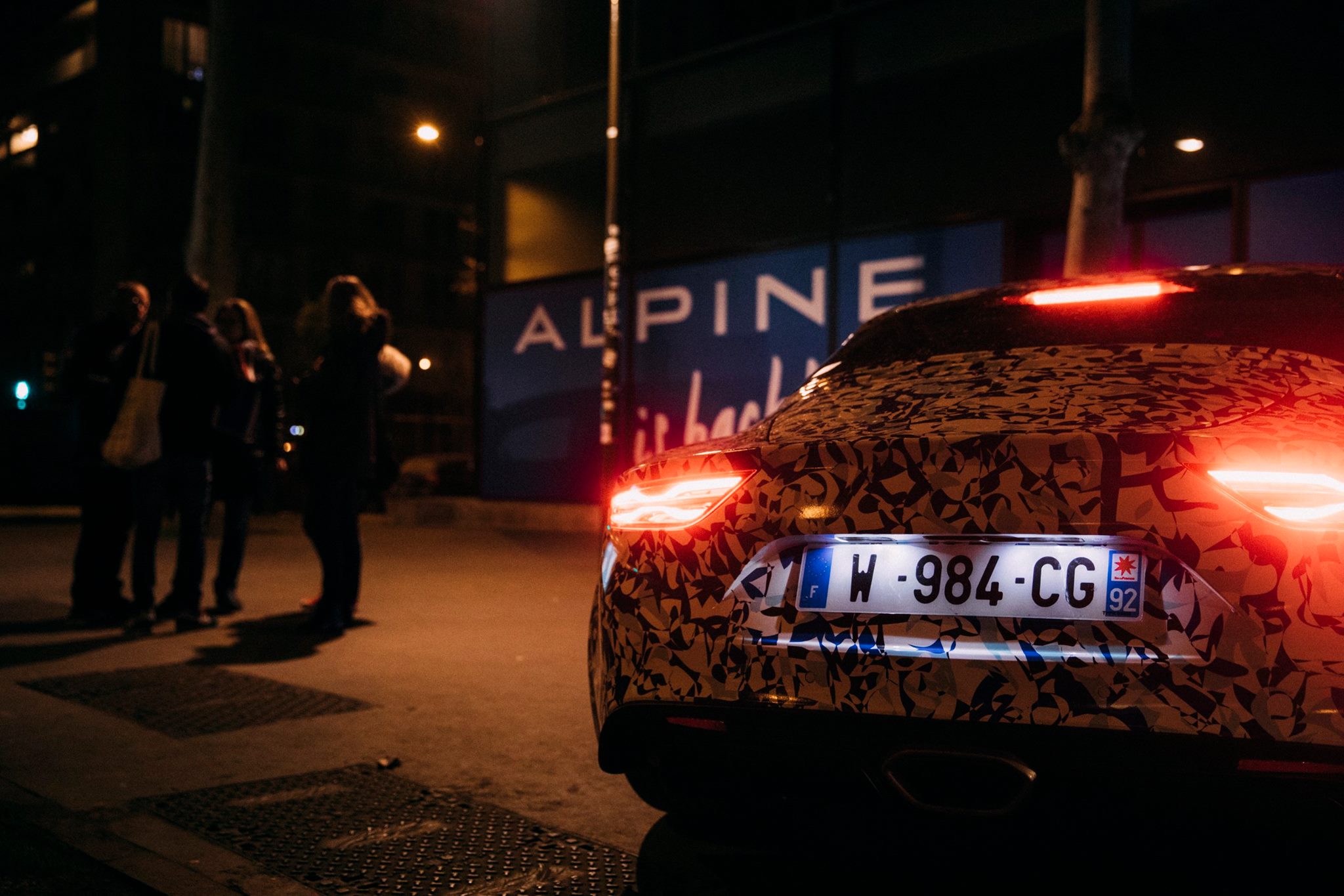 Michael van der Sande, le directeur général d’Alpine, s’est chargé personnellement de cette sortie nocturne sur les Champs-Elysées et dans la proche banlieue, notamment à La Défense. Malgré la piètre qualité des photos, on remarque un joli camouflage dynamique et on peut surtout observer les formes définitives de la berlinette.