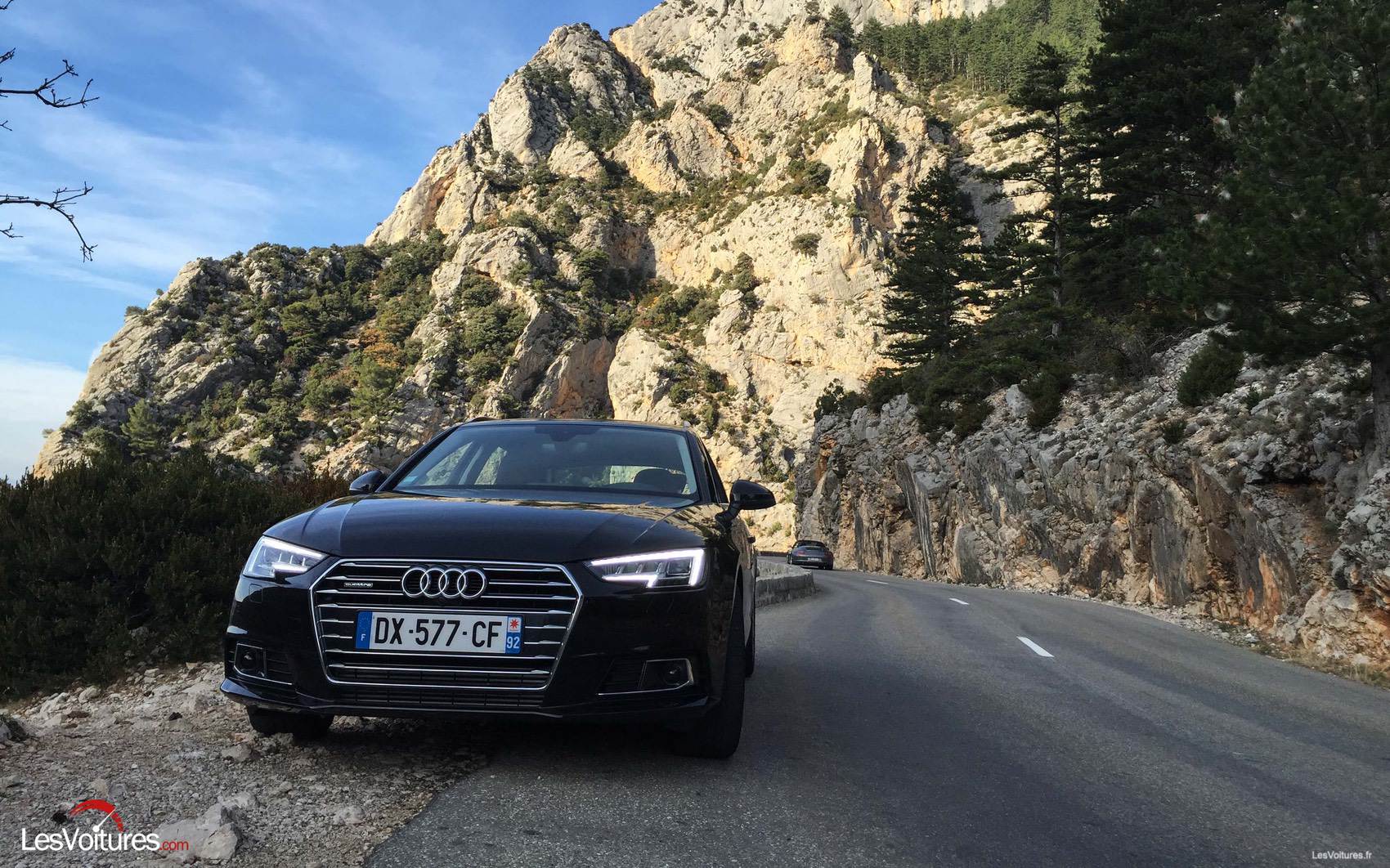 L’Audi A4 Avant est donc une auto parfaitement équilibrée. Un design sobre mais musclé, faisant un peu penser à un break de chasse (seulement un millimètre de plus que l’Audi A4 berline). Des performances et un comportement au-delà de la norme, qui suffiront à ravir le commun des mortels et même un peu plus. Une sobriété avérée, puisque la consommation mixte est annoncée à 5,3 l/100 km. Même si en condition d’essai nous avons consommé un peu plus, ce 5,3 l/100 km semble réaliste avec une conduite apaisée de bon père de famille et le confort de route est surprenant : « l’Audi A4 Avant est sans aucun doute l’auto la mieux insonorisée du segment, ce qui a été très agréable sur les portions d’autoroute que nous avons empruntées à l’essai » nous a livré Laurent. Une belle habitabilité, puisque quatre adultes pourront voyager sans peine, et loger leurs bagages dans les 505 l de coffre. Le volume de chargement peut même monter jusqu’à 1 510 l en rabattant les sièges. Le hayon est motorisé et peut être ouvert d’un passage du pied sous le bouclier. Terminons par vanter l’affichage tête haute, qui affiche aussi bien la vitesse actuelle, les limitations de vitesse ou encore les indications du GPS. On ne peut plus s’en passer !