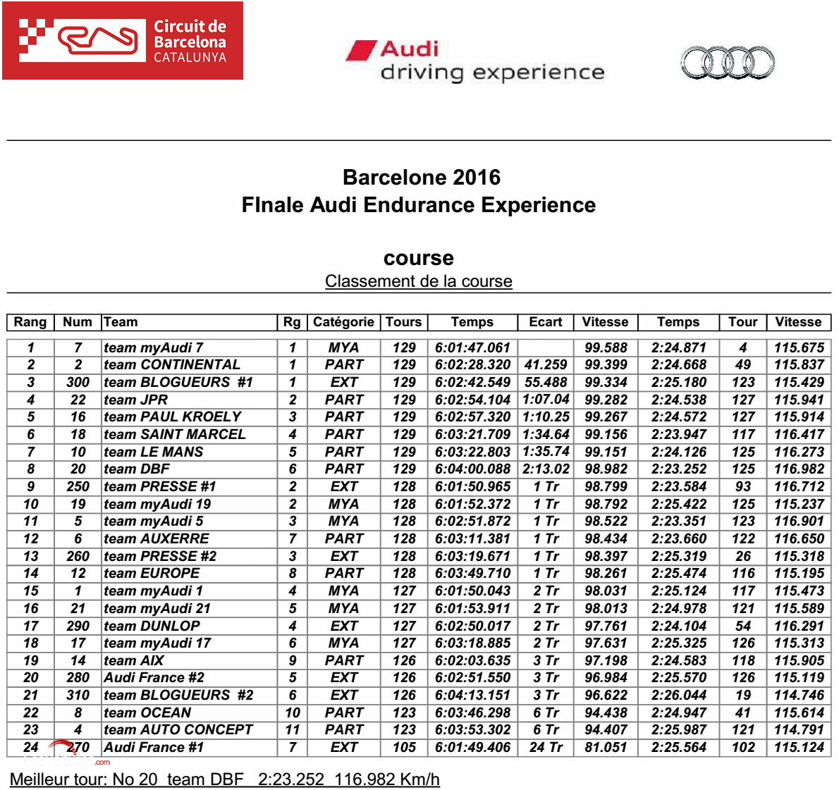 C’est Géraldine qui a été choisie pour prendre le départ. Les femmes sont souvent plus calmes au volant que les hommes. Au feu vert à 14h00 précises, ma coéquipière gère sans encombre le trafic et se fait plaisir grâce à quelques dépassements. Les relais d’environ 20 min s’enchaînent. Après les 3 premiers de Géraldine, Sébastien prend le volant puis c’est à mon tour d’attaquer la finale aux alentours de 15h20. Notre Audi #260 est alors située à la 16ème place.