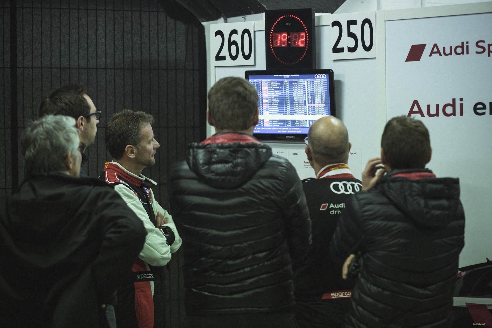 A la nuit tombée, Géraldine reprend le volant à 17h57. Les temps au tour chute alors, tout s’assombrit, il est alors délicat de retrouver ses marques. Herbert m’annonce que je vais finir la course une fois que Sébastien aura effectué à son tour ses relais. Peu après 19h00, je m’assoie dans le siège baquet de l’Audi. Concentré, j’applique la décision qui a été prise de ménager l’auto mais peut-être un peu trop (2 min 36 s au tour). Les freins sont au bout de leur vie et le pneu avant gauche, très sollicité sur le circuit, donne des signes de fatigue extrême. Mais, à la radio, Herbert me demande d’accentuer le rythme.