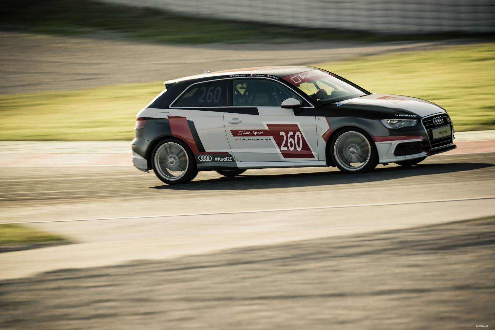 Après avoir fait connaissance avec mes coéquipiers, Géraldine Gaudy (Auto Plus) et Sébastien Jaquemart (La Voix du Nord), notre instructeur, Herbert Martin, nous accueille aux côtés de notre Audi A3 Sportback #260 (Team Presse #2). Pour l’occasion, la compacte n’a pas subi de modifications mécaniques. Mis à part les éléments de sécurité qui lui ont été greffés (arceaux, harnais 3 points, etc…), la présence des sièges baquets et le démontage de la banquette arrière, cette A3 est 100% d’origine, pneus et freins inclus. Cela va vite avoir son importance en matière de stratégie de course.