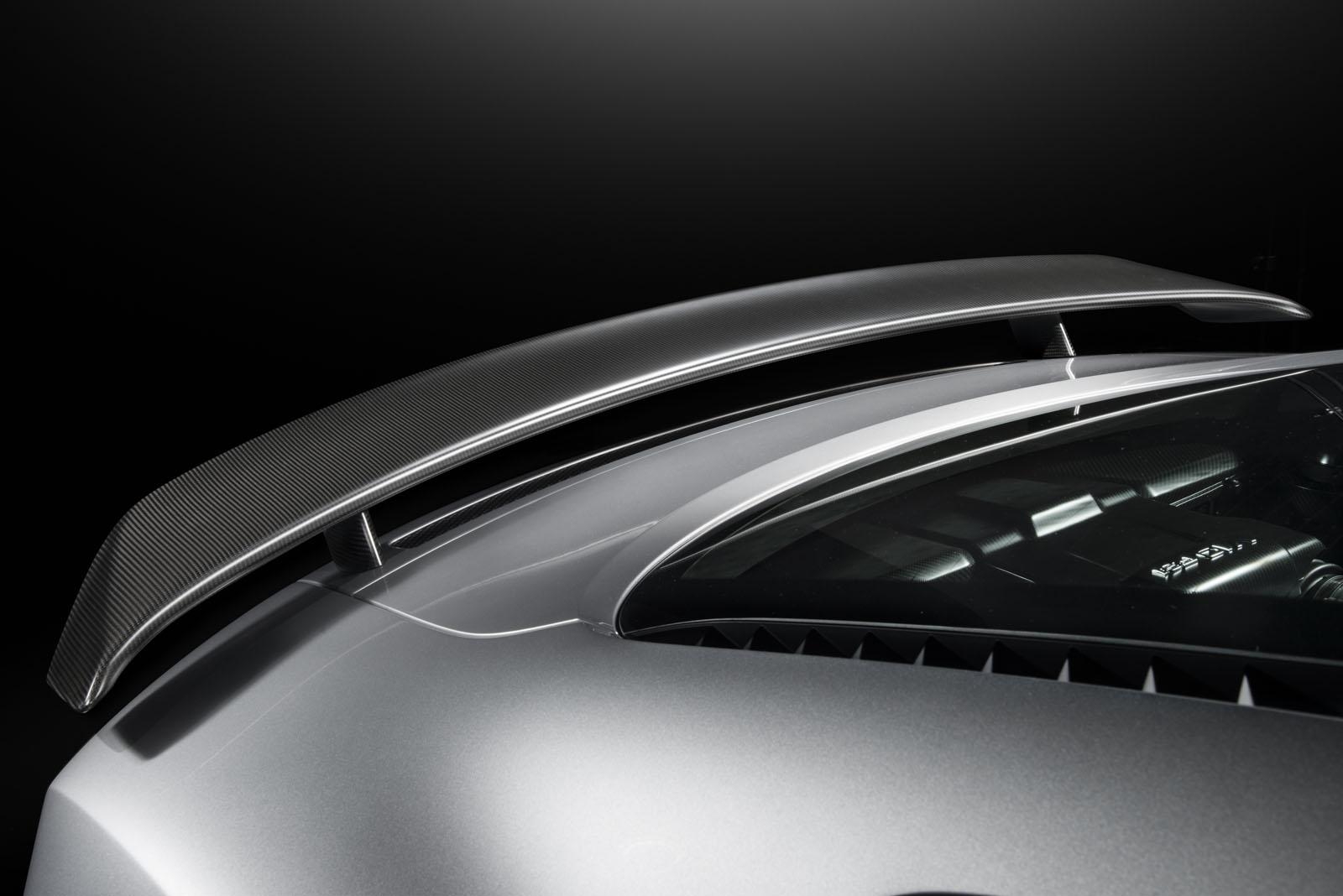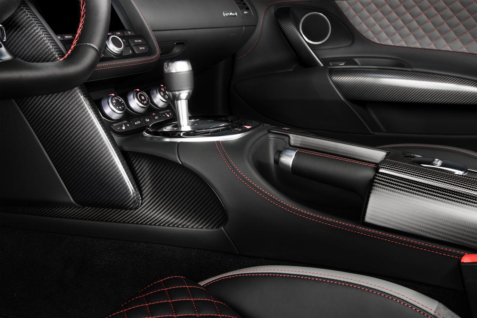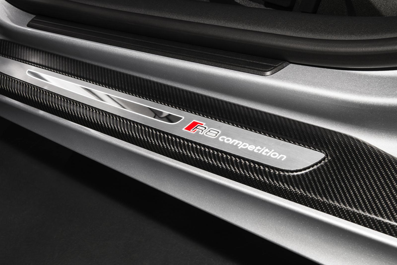 Elle est en effet très présente à travers la finition de la R8 Competition : spoiler avant, jupes latérales, forme des rétroviseurs, spoiler arrière à diffuseur intégré. Les jantes en noir brillant et les sorties d’échappement sont exclusives à cette pure Audi. Tous ces éléments reprennent la fibre de carbone, matériau que l’on retrouve à l’intérieur de la R8. Comme une invitation à monter à bord, les seuils de portes sont illuminés R8 Competition.