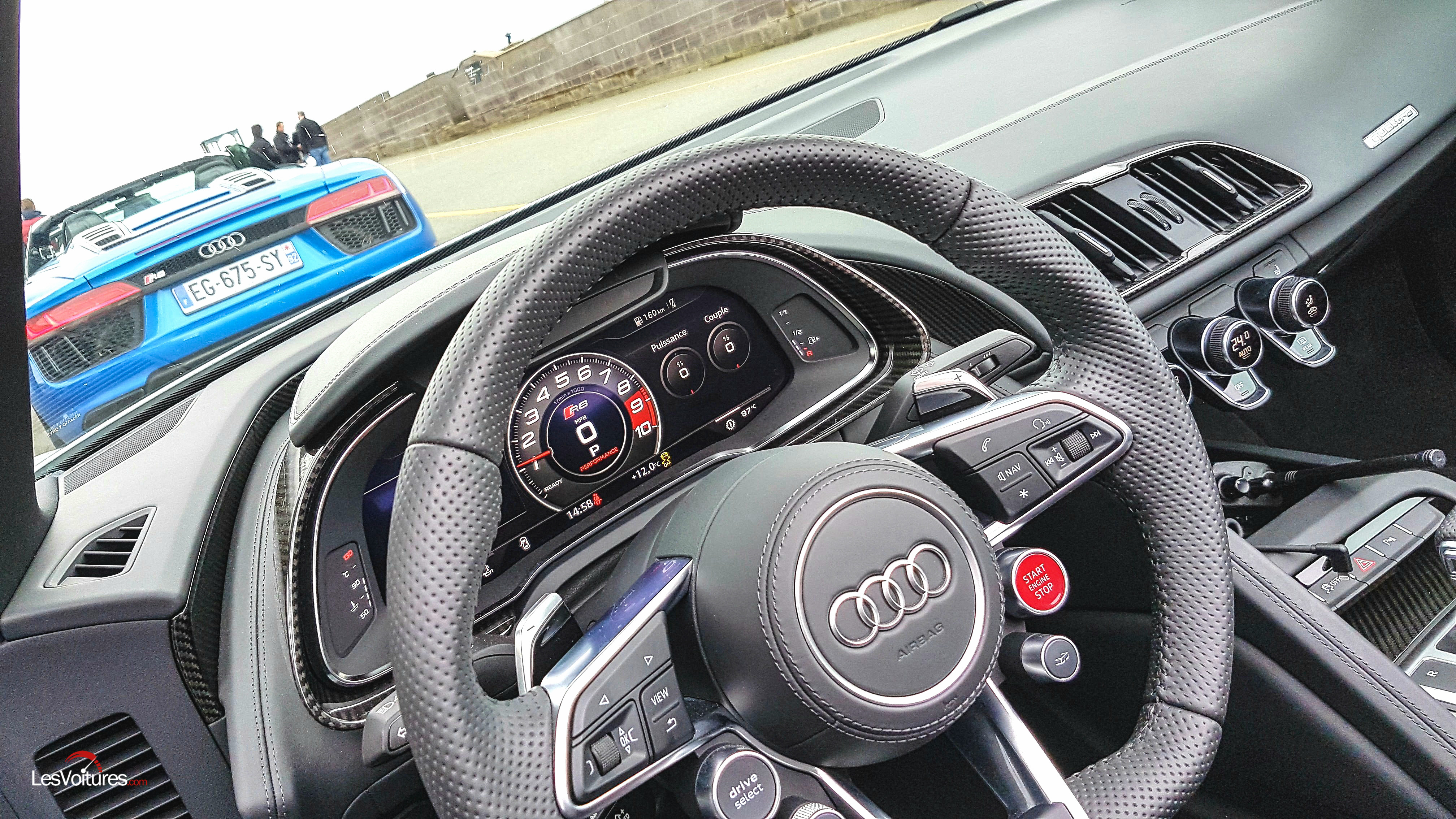 Côté mécanique le V10, qui a été porté à 540 ch, est accouplé à une nouvelle transmission inédite. Ces évolutions laissent présager un comportement exemplaire. De surcroît, le nouveau montant central composé de carbone et d’aluminium fait gagner en rigidité. Sur le papier, ou plutôt sur le bitume, le spyder aux anneaux n’a rien à envier au coupé. Mais, en bord de piste, c’est surtout ce nouveau mode « performance » qui laisse rêveur : Gaz !