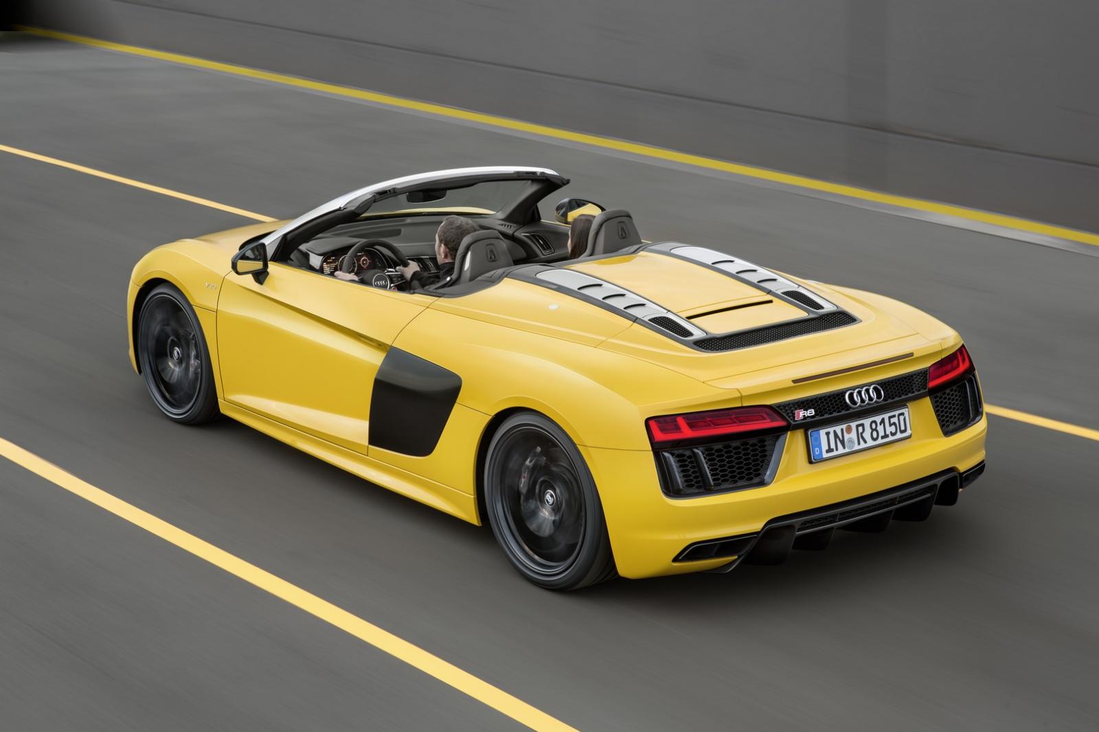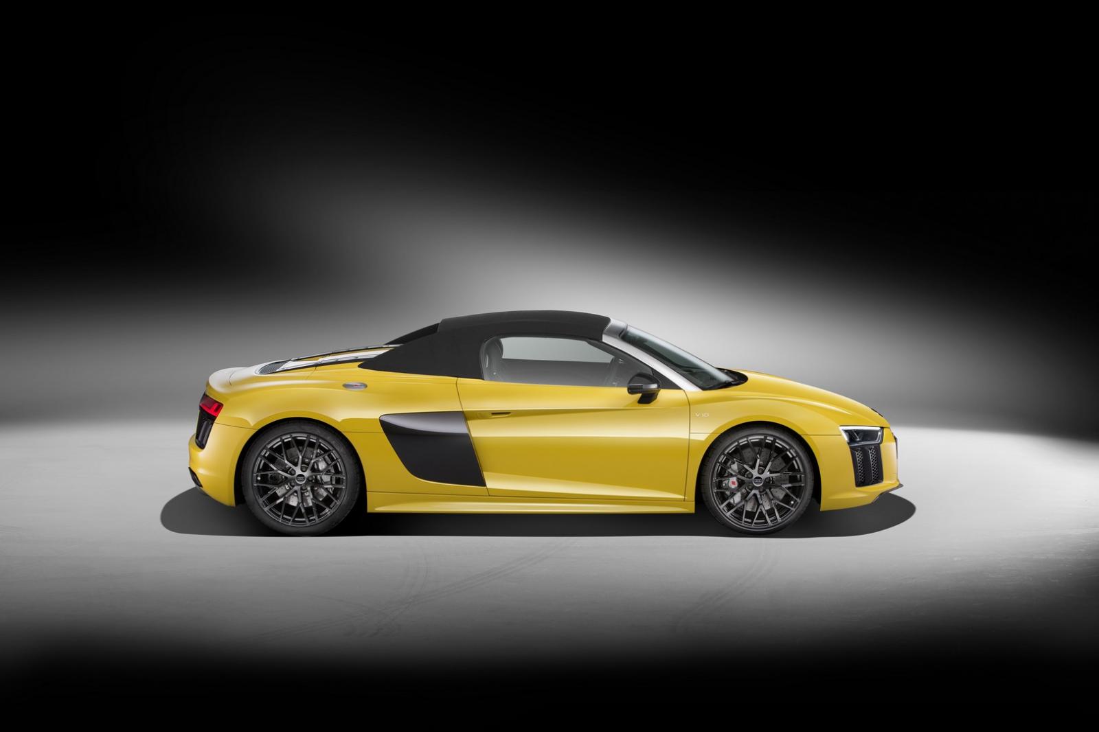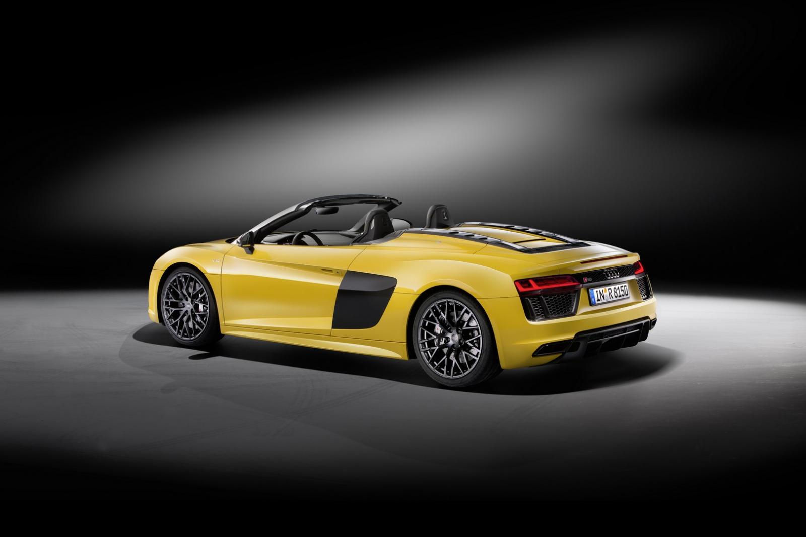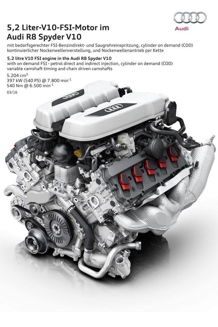 Sous son capot, la R8 Spyder 2016 embarque le V10 de 5.2 l atmosphérique qui développe 540 chevaux. Cette configuration est la moins puissante du V10 FSI. Chiffre identique pour le couple envoyé au quatre roues. Du côté des performances, Audi annonce un 0 à 100 km/h abattu en 3,6 s et une « V Max » de 318 km/h.