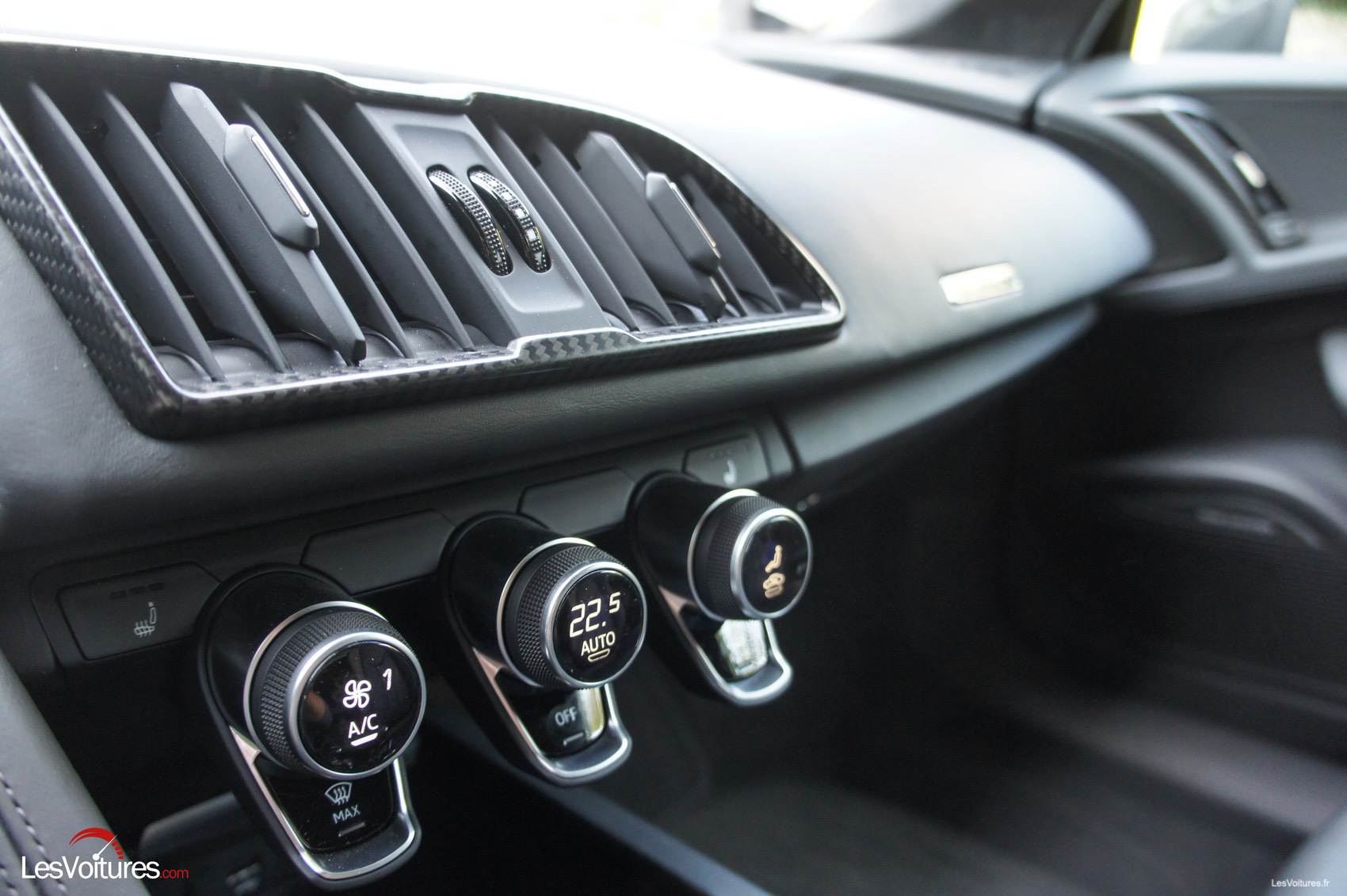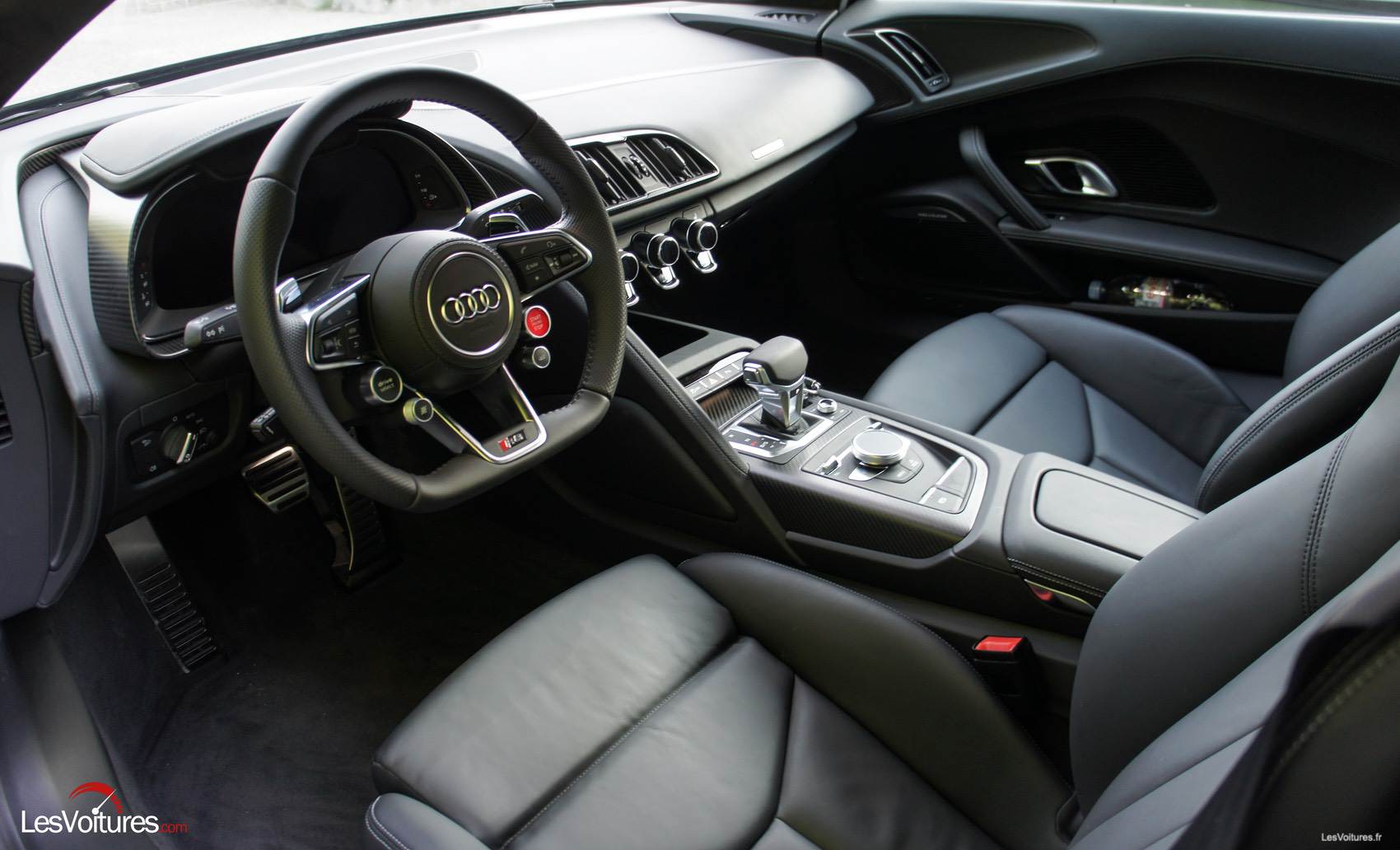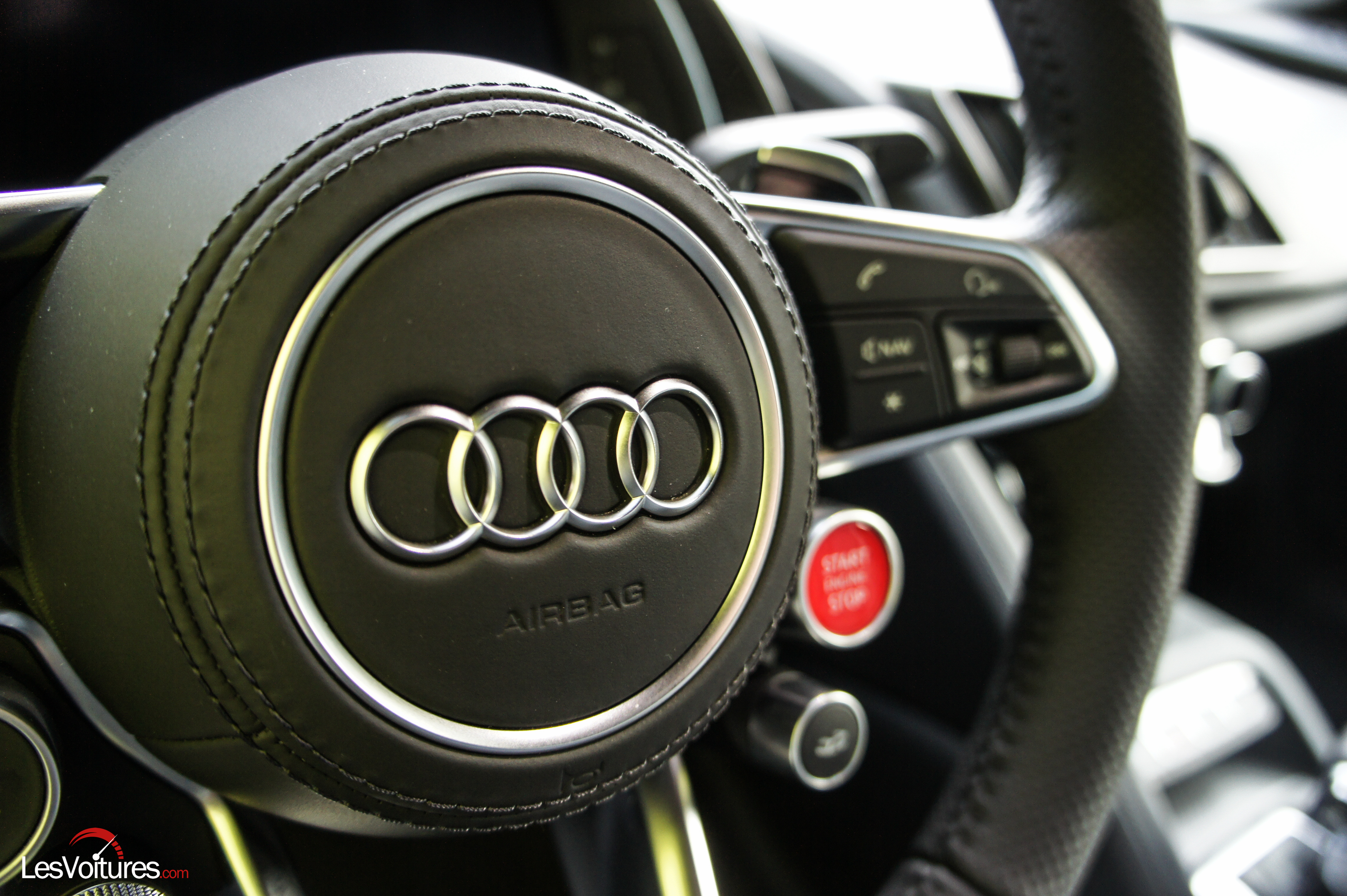 Le cockpit de l’engin est digne du design extérieur. Racé, pur, à la hauteur des exigences de la firme d’Ingolstadt en termes de finition, c’est-à-dire parfait. Le tableau de bord virtuel 3D est repris dans ce modèle. Une fois pris en main, il se révèle particulièrement efficace pour gérer intégralement les paramètres de l’automobile, ainsi que l’info-divertissement : mode de conduite à travers l’Audi Drive Select, radio, GPS, téléphone, applications du téléphone, etc. Votre chanson préférée sortira alors par les hauts-parleurs de l’excellent Bang & Olufsen Sound System, pour essayer de couvrir les hurlements rageurs de la bête.