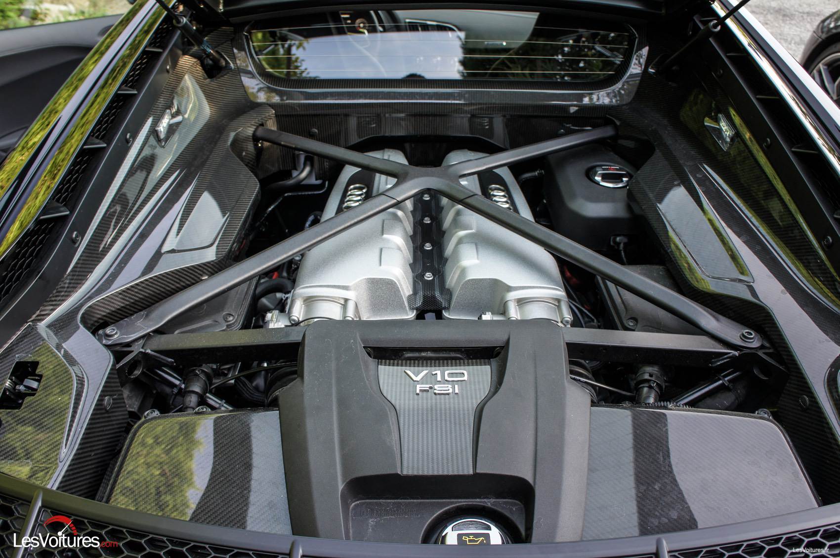 Côté motorisation, le comparatif peut quasiment être repris. Sur les premiers mètres au moins ! Le cœur de la R8 V10 plus n’est autre qu’un V10 atmosphérique de 5.2 l de cylindrée, développant la bagatelle de 610 chevaux à 8250 tr/min ! Un ouragan de puissance prêt à se déchaîner en moins de temps qu’il n’en faut pour le dire ! Cette débauche de chevaux est transmise aux quatre roues via la transmission quattro, dont l’efficacité n’est plus à prouver.