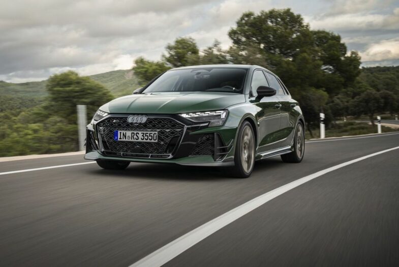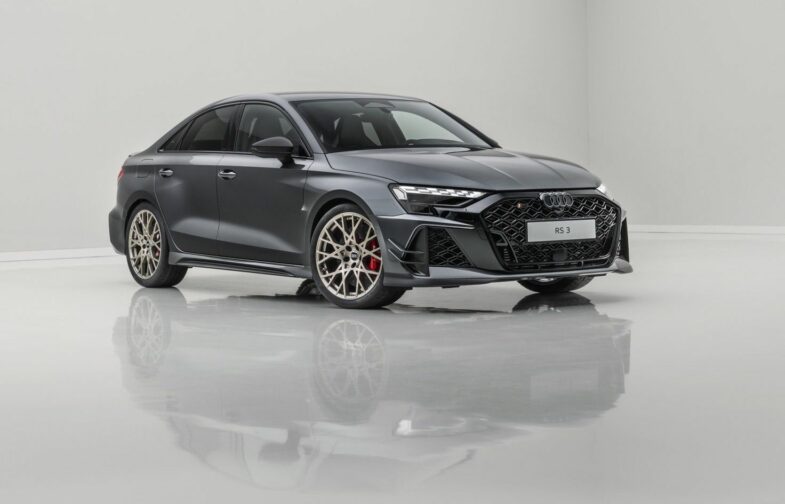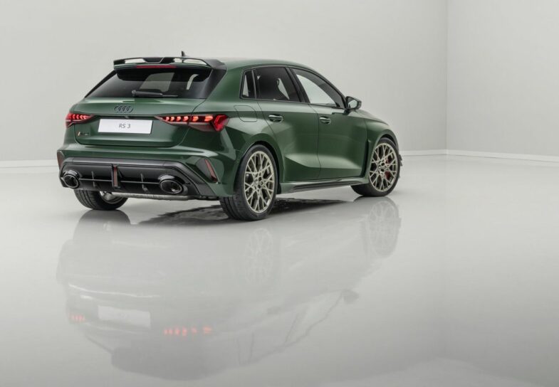 Les jantes de 19 pouces à dix branches en croix, proposées en « Or néodyme mat », ajoutent une touche spectaculaire. Les projecteurs « Matrix LED » assombris affichent une animation lumineuse unique reprenant l’ordre d’allumage du 5‑cylindres : « 1‑2‑4‑5‑3 ». Trois teintes sont disponibles sur : « Gris Daytona », « Blanc Glacier mat » et le nouveau « Vert Malachite », clin d’œil direct à l’Audi Sport quattro de rallye. Ci-dessous en photo, la version berline tricorps de l‘Audi RS 3 competition limited qui n’a donc pas été vendue en France.