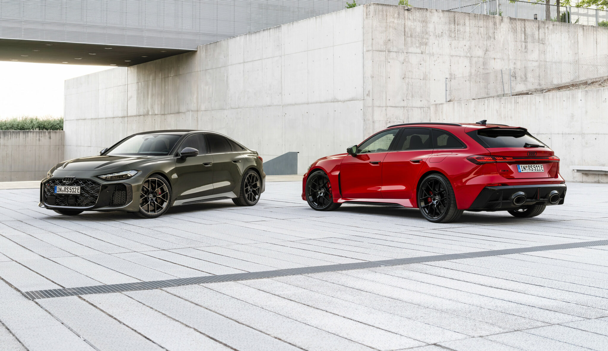 Les faces avant des Audi RS 5 Sedan (berline) et Avant (break) adoptent une calandre « Singleframe » entièrement noire, ornée d’un motif en nid-d’abeilles, accompagnée de prises d’air latérales élargies. Les optiques, redessinées, affichent un motif à damier inspiré de la compétition. Des entrées d’air supplémentaires derrière les ailes avant renforcent encore la signature visuelle.