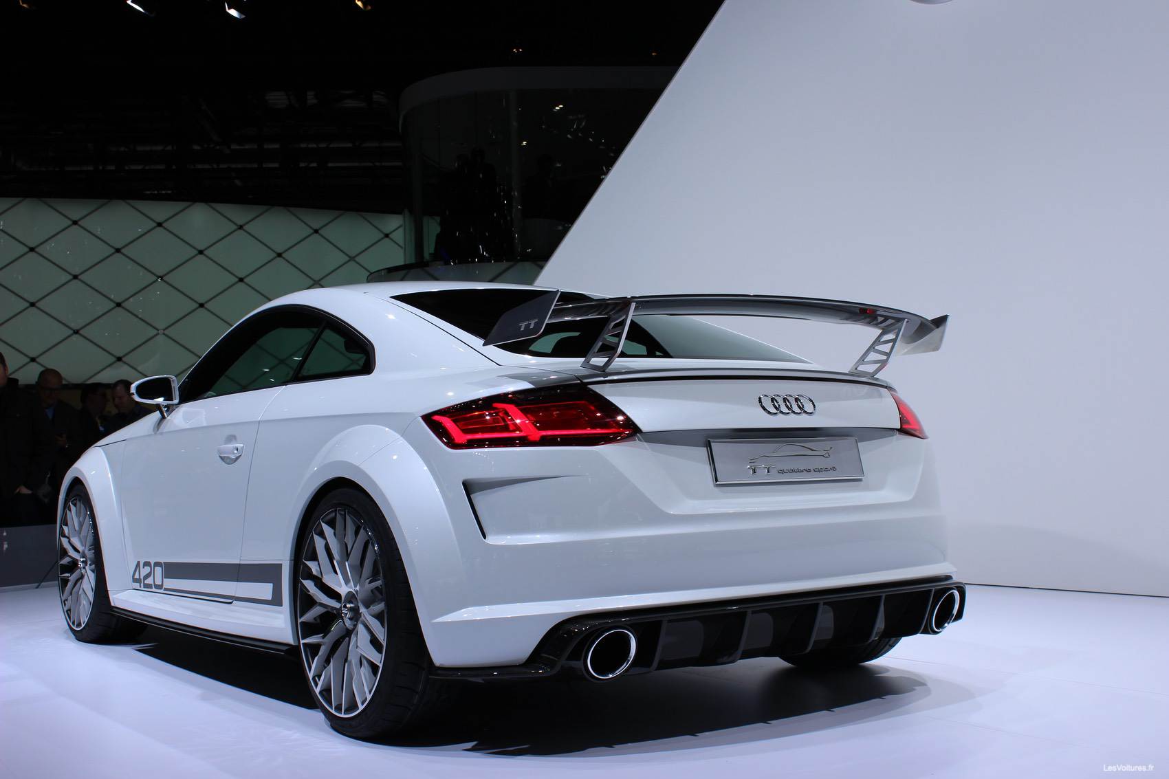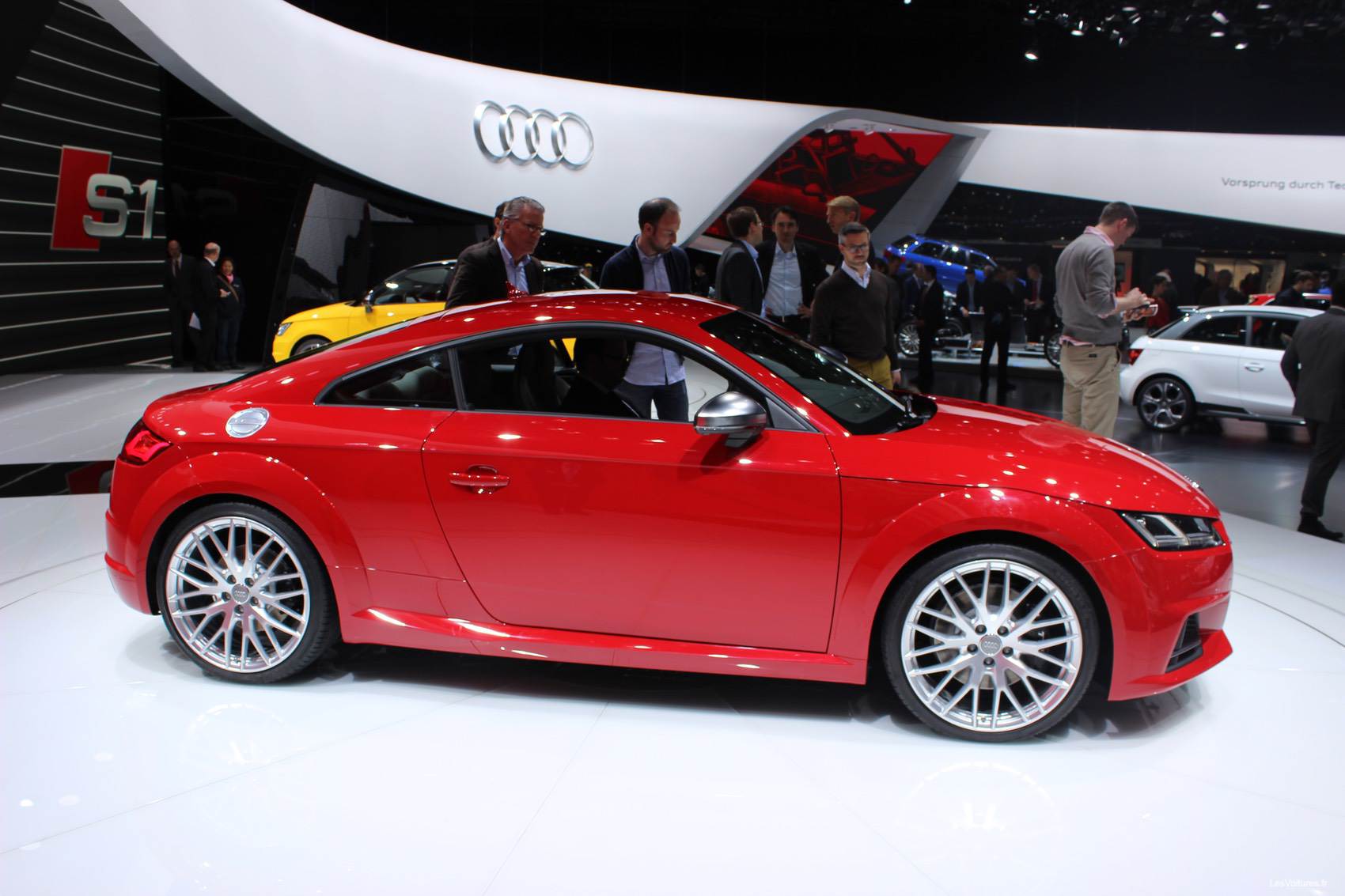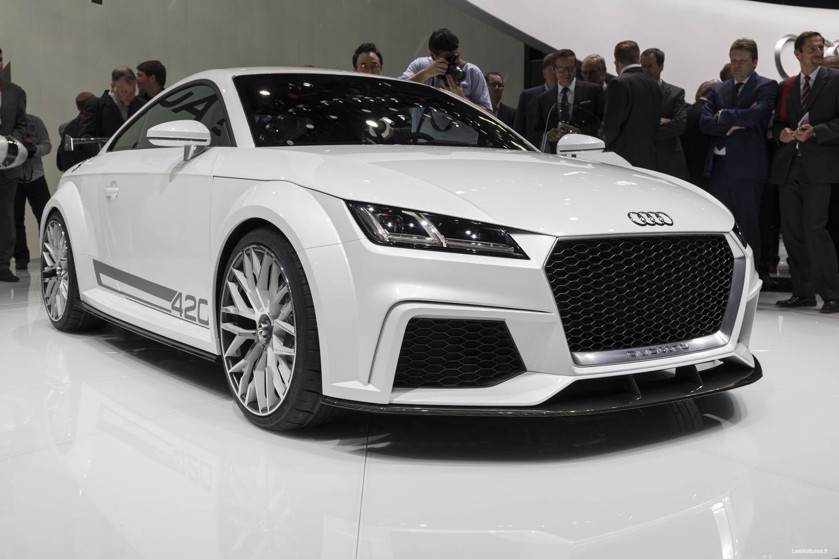 L’Audi TT 2014 n’est pas venue seule à Genève. Les 210 ch/l de l’Audi TT Quattro Sport Concept repousse les limites du downsizing. Mais d’après nos informations, le 2.0 TFSI qui équipe cette « show car » ne sera pas sous le capot de la future TT RS. La firme d’Ingolstadt conservera un bloc de 5 cylindres pour mouvoir la plus extrême des TT. Le concept TT Quattro Concept vole littéralement la vedette à l’Audi R8 très discrète au salon de Genève.