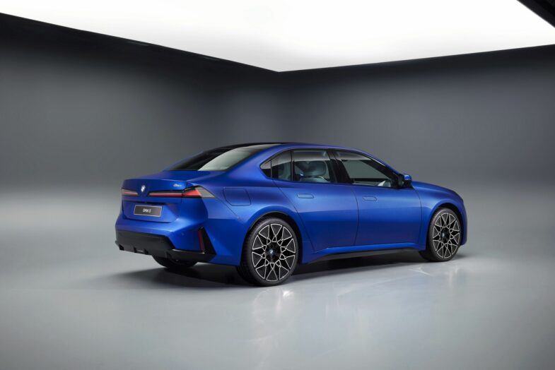 Les flancs de la BMW i3 100 % électrique mettent en avant un pare‑brise et une lunette arrière très inclinés, une ceinture de caisse ascendante et une malle courte et verticale. Les ailes élargies et les jantes de 21 pouces renforcent la posture sportive. Les bas de caisse ont été dessinés pour donner l’impression que la voiture s’élance vers l’avant, même immobile.
