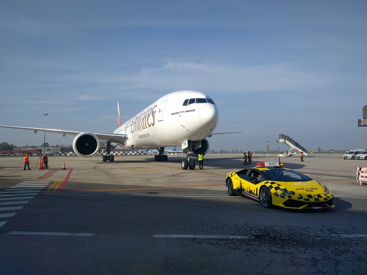 « Ici Clarence Avou, à vous, Roger, il y a une Lamborghini sur la piste ! » Cette réplique mythique du film Y a-t-il un pilote dans l’avion ?, revue par nos soins, est parfaite pour présenter une opération promotionnelle organisée entre l’aéroport de Bologne et Lamborghini. Ainsi et pendant quelques jours, c’est bien une Huracán LP 610-4 qui accompagne les avions sur le tarmac. La Supercar de Sant’Agata Bolognese a bien sûr été équipée d’une rampe de feux pour l’occasion et arbore une livrée très visible. Ainsi, les touristes qui arrivent à Bologne seront obligés de se rappeler que le musée Lamborghini est situé, comme l’usine, tout près de Bologne.