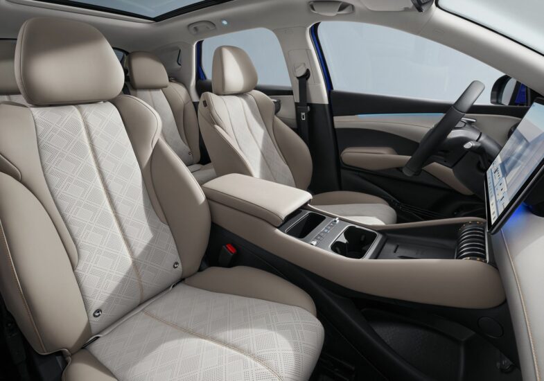 Sur le plan du design, les évolutions sont plus subtiles mais bien présentes sur le SUV BYD Atto 3 Evo. Les boucliers avant et arrière ont été redessinés, les jupes latérales retouchées et le becquet arrière revu. De nouvelles jantes 18 pouces complètent la mise à jour. Si la longueur reste fixée à 4,45 m, la nouvelle plateforme permet d’optimiser l’espace utile. Le coffre gagne 50 l pour atteindre 490 l, et un compartiment supplémentaire apparaît sous le capot avant, offrant 101 l supplémentaires. La transition est toute trouvée pour passer à la présentation de l’intérieur du BYD Atto 3 Evo.
