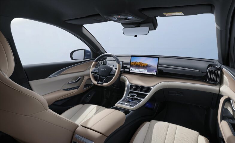 À l’intérieur, le BYD Sealion 5 DM-i privilégie l’espace et la convivialité. Les lignes fluides de la planche de bord enveloppent les occupants tout en conservant une impression de légèreté. Le combiné numérique de 8,8″ et l’écran tactile de 12,8″ regroupent toutes les fonctions essentielles, avec commandes vocales « Hi BYD », compatibilité Apple CarPlay et Android Auto, et mises à jour OTA. Les passagers bénéficient d’un confort généreux, avec de la place pour cinq adultes et un coffre de 463 l, extensible à 1 410 l grâce à la banquette arrière rabattable. La fonction Vehicle-to-Load (V2L) permet en outre d’alimenter des appareils externes jusqu’à 3,3 kW, transformant le SUV en compagnon idéal pour les familles.