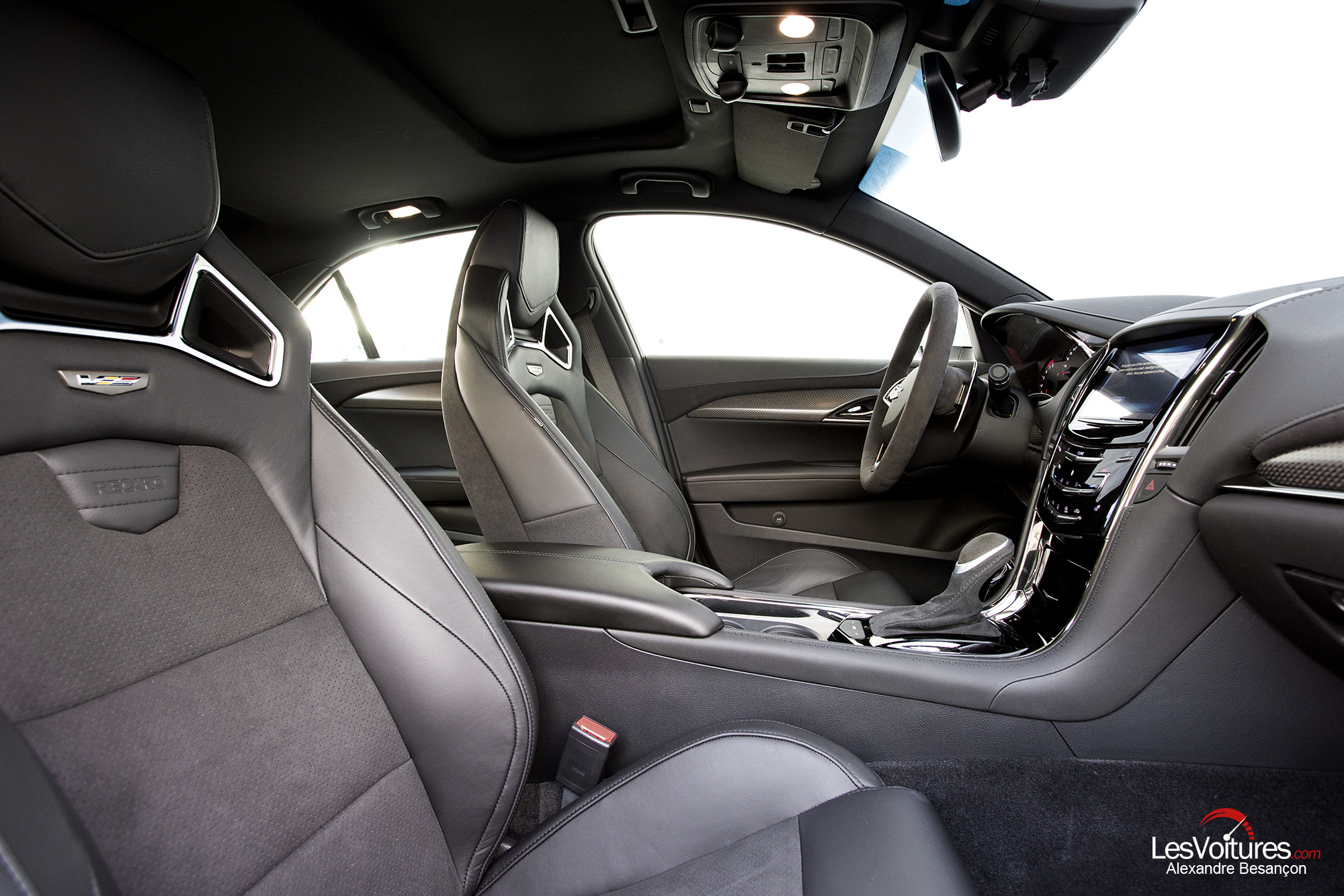 A l’intérieur, l’ATS-V est beaucoup moins cossue que la CTS-V. Le contraste est saisissant, même s’il faut avouer que les Américains progressent en matière de finition. Les matériaux choisis sont d’excellente qualité, mais il manque encore de la précision dans l’assemblage et certains éléments sont trop basiques, à l’image de la commande de boîte de vitesses ou encore le plexiglas de l’écran du tableau de bord. En revanche, une fois assis au volant de l’ATS-V Sedan, le confort est optimal.