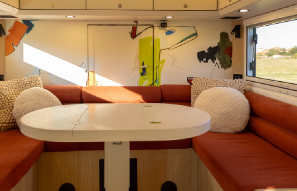 On y trouve une cuisine équipée comme à la maison, avec plaque à induction, four vapeur, réfrigérateur, lave-vaisselle, machine à café et Thermomix. La salle d’eau traversante comprend une douche à l’italienne, une vasque en résine minérale et des toilettes sèches. Le couchage est assuré par un lit king size longitudinal, tandis qu’un salon en U modulable complète l’espace de vie de ce camping-car de l’aventure. Chaque détail est pensé pour offrir une expérience haut de gamme, même en pleine nature.