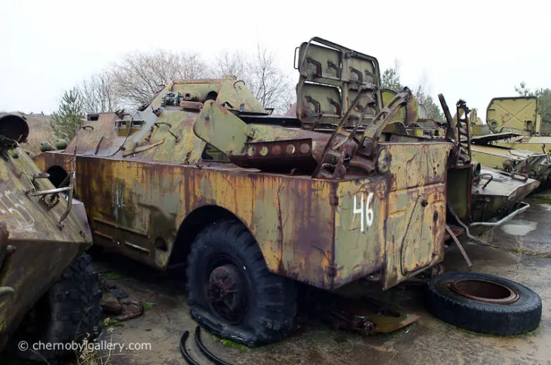 Dans les profondeurs de Buriakivka, les véhicules militaires dominent le paysage. Camions de transport de troupes, fourgons d’intervention, engins spécialisés : tous ont servi à déplacer les soldats de la République socialiste soviétique d’Ukraine, alors intégrée à l’URSS. Ces hommes, souvent jeunes et mal informés, furent envoyés en première ligne pour contenir l’incendie, évacuer les populations, sécuriser les zones contaminées. Beaucoup ont payé de leur santé, parfois de leur vie, cette mobilisation d’urgence.