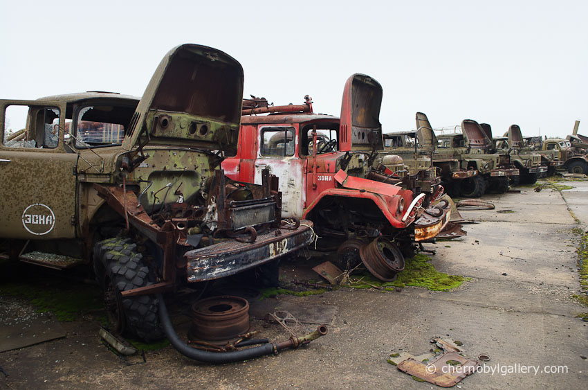 Dans les profondeurs de Buriakivka, les véhicules militaires dominent le paysage. Camions de transport de troupes, fourgons d’intervention, engins spécialisés : tous ont servi à déplacer les soldats de la République socialiste soviétique d’Ukraine, alors intégrée à l’URSS. Ces hommes, souvent jeunes et mal informés, furent envoyés en première ligne pour contenir l’incendie, évacuer les populations, sécuriser les zones contaminées. Beaucoup ont payé de leur santé, parfois de leur vie, cette mobilisation d’urgence.