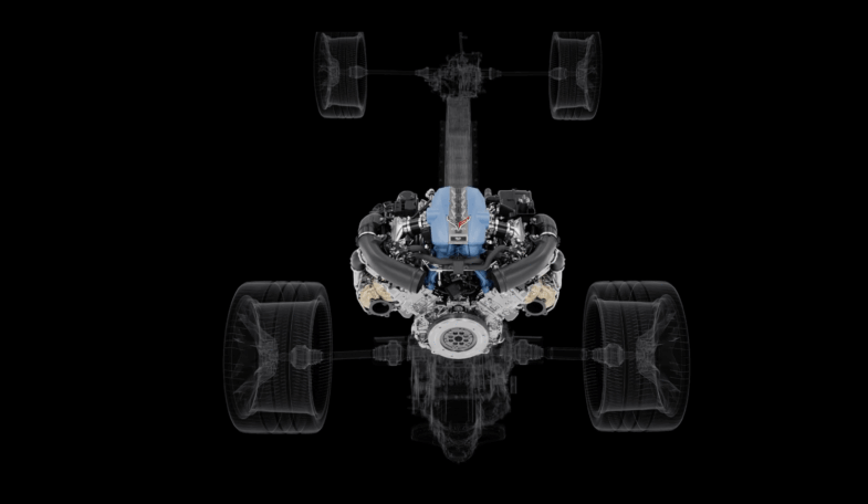 Au cœur de la motorisation hybride de la Chevrolet Corvette ZR1, le bloc thermique LT7 trône dans une configuration biturbo, toujours en position centrale arrière. Il développe 1 079 ch à 7 000 tr/min et 1 123 Nm de couple à 6 000 tr/min. Il s’agit du moteur V8 de série le plus puissant jamais produit par la marque. Il entraîne l’essieu arrière via une transmission à double embrayage (8 rapports), taillée pour encaisser une telle déferlante de puissance. À l’avant, un moteur électrique de 189 ch et 197 Nm vient épauler le V8. Contrairement à un système hybride classique, aucun lien mécanique n’existe entre les deux essieux : la coordination s’effectue de manière entièrement électronique, assurant une répartition dynamique et intelligente du couple selon les conditions de conduite.