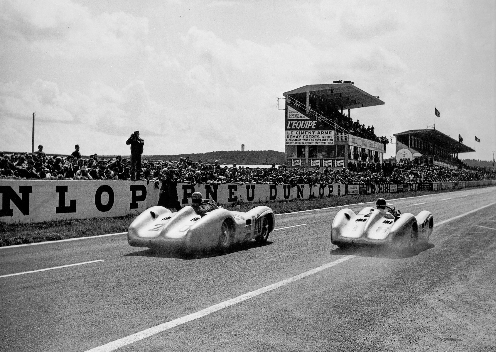 Situé à quelques kilomètres de Reims, le tracé de 7,816 km a accueilli pas moins de 14 GP de France entre 1938 et 1966, avant de cesser définitivement son activité en 1972. Le circuit de Reims-Gueux, bordé de bâtiments encore debout, reste marqué par ses tribunes monumentales couvertes de publicités d’époque à la gloire d’Elf et de Total, témoins d’une époque où la course automobile se mêlait à l’essor industriel et énergétique français.