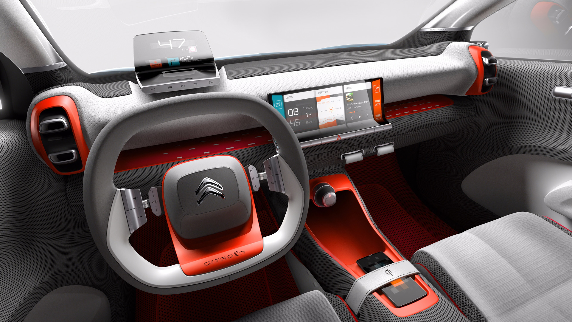 A l’intérieur, et une fois les portes à ouverture antagoniste déployées, l’impression d’espace est saisissante. On remarque la présence de nombreux rangements et une épuration poussée à son maximum en termes de commandes. Les deux écrans, un HUD positionné au-dessus du volant, un autre de 12″ au centre de la console, permettent l’accès aux paramétrages et fonctionnalités du concept. A la fois chaleureuses et sobres, les textures choisies sont en accord avec celles proposées sur la Citroën C3 et le C4 Cactus. Quant aux sièges, ils sont une invitation à rouler grâce à des formes enveloppants à souhaits.