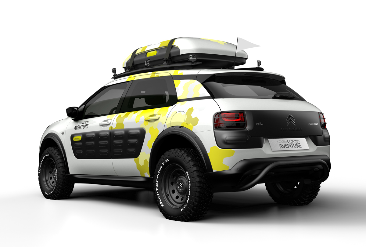 La C4 Cactus Aventure est ainsi équipée de multiples nouvelles protections pour affronter la nature sauvage : élargisseurs d’ailes, bas de caisses renforcés, barres de protection à l’avant et à l’arrière (qui apparaissent bien petites pour affronter un Tyrannosaurus Rex). Dans cette version, la C4 Cactus est plus haute de quelques centimètres et adopte de « gros boudins » et des jantes en tôle noires du plus bel effet. Les BF Goodrich Mud Terrain T/A étant plus adaptés aux chemins difficiles. Quant au coffre de toit, il est équipé de projecteurs à LED à longue portée.